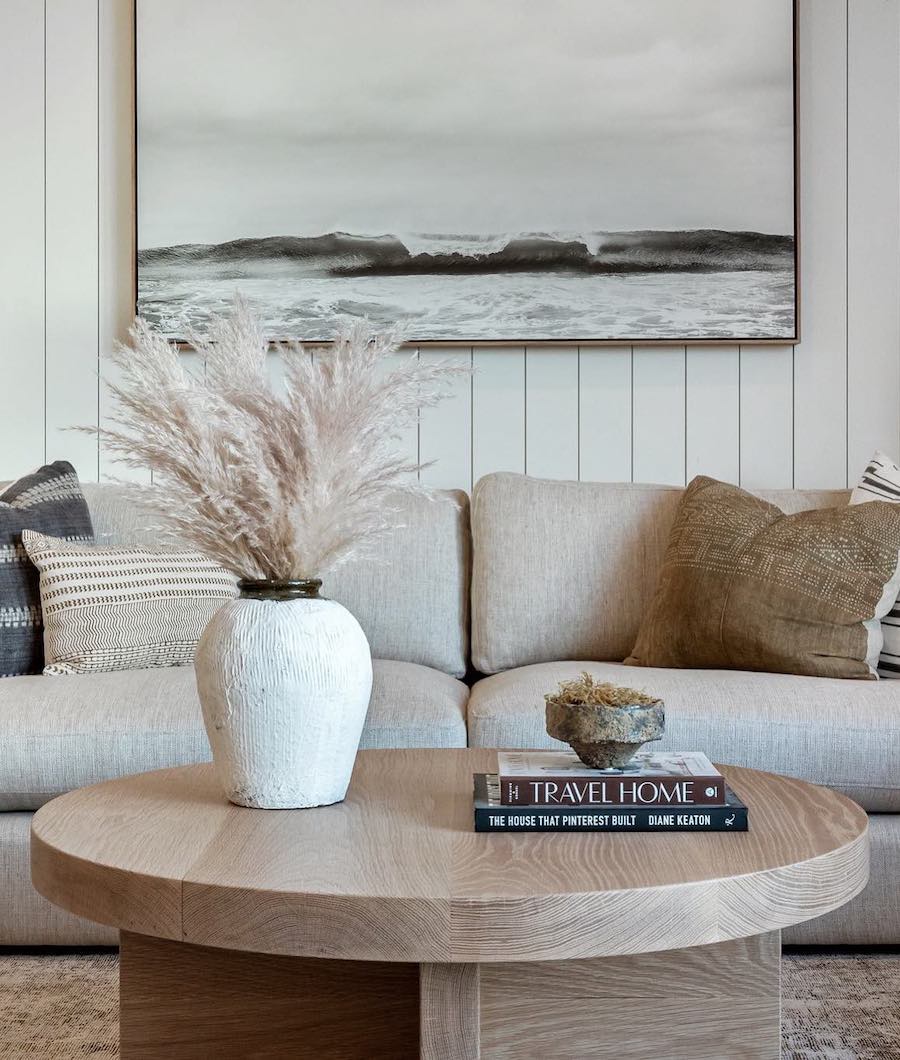 Fluffy pampas grass and gorgeous ocean photography give this living room a subtle coastal vibe that’s both laid-back and chic.