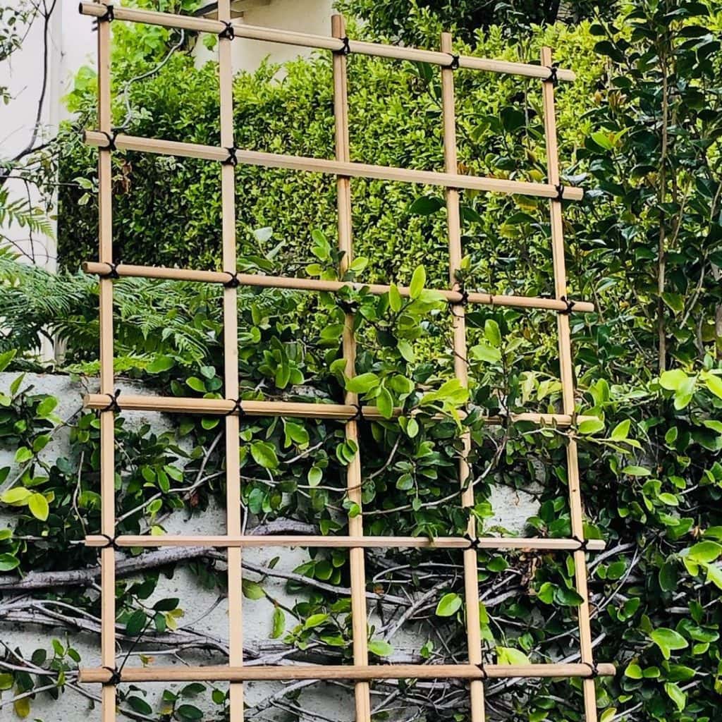 Is it a trellis? Is it a wall hanging? Who can tell! This DIY trellis design is a completely “au naturel” take on a garden trellis. You can recreate this design using items from your home itself! All you need are some tree branches and any scrap twine you have. Next, connect each wooden branch with twine in order of height (shortest to longest). You can add as many branches depending on the height you want for your trellis.