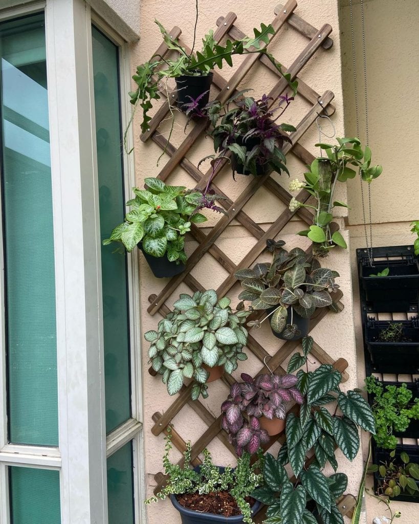 I love this crisscross wall trellis idea, especially due to its dark ashy stain. It looks very elegant mounted in any type of wall from bricked to concrete. Also, the trellis is perfect for hanging different types of plants together. This is also an excellent way to reuse some scrap wood pieces and giving your outdoor space a stylish touch!