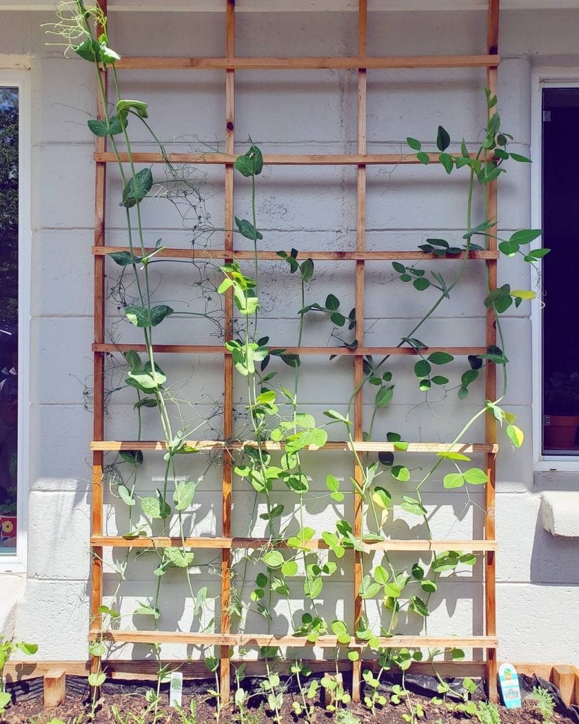 This pea trellis idea is a fun project to recreate with your kids and is perfect for tiny pea plants. Build a frame using four bamboo/wooden poles and connect them using twine. Wrap the same twine up and down the frame, keeping it taut. The pea tendrils will hold onto the twine easily while making this trellis look super adorable.