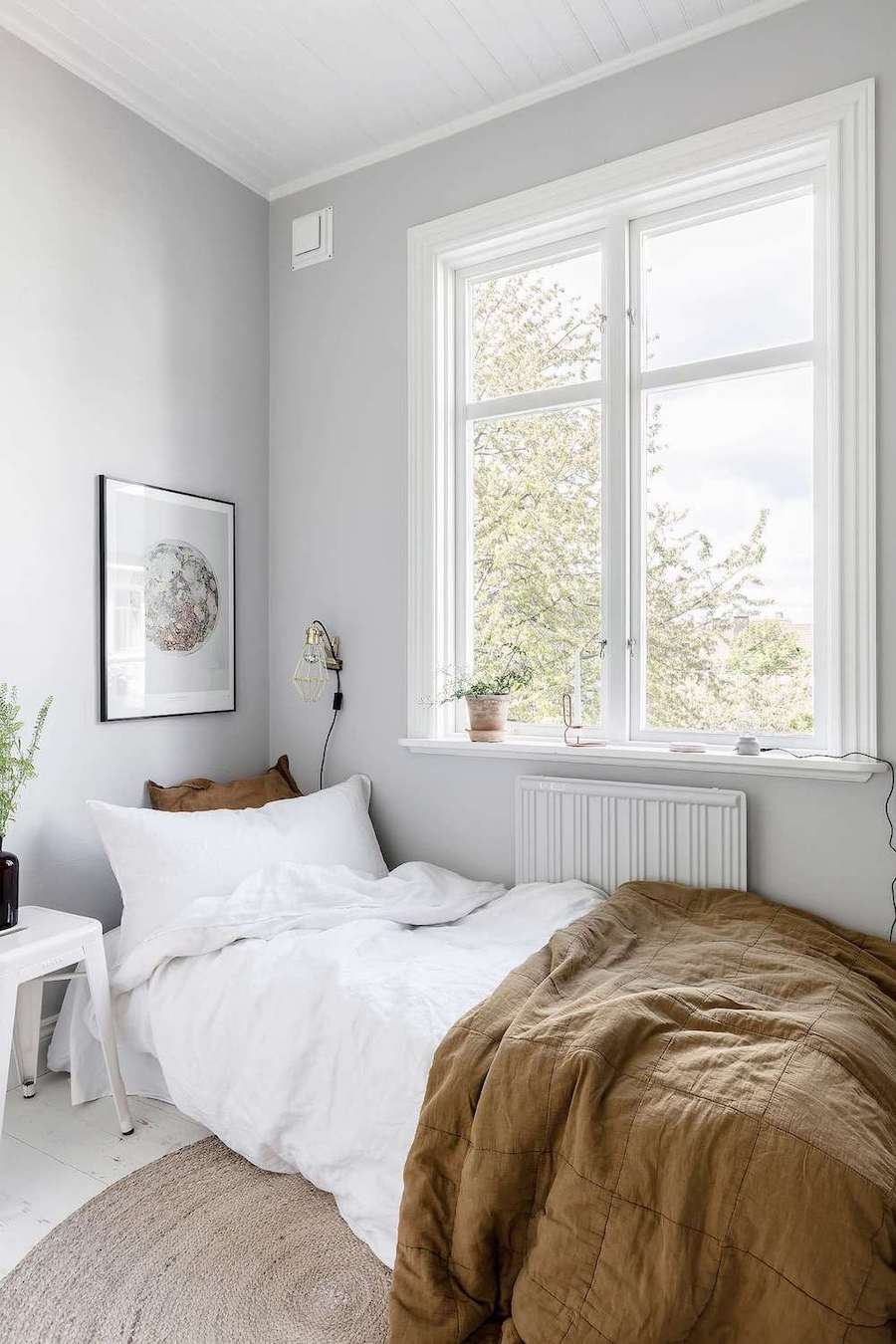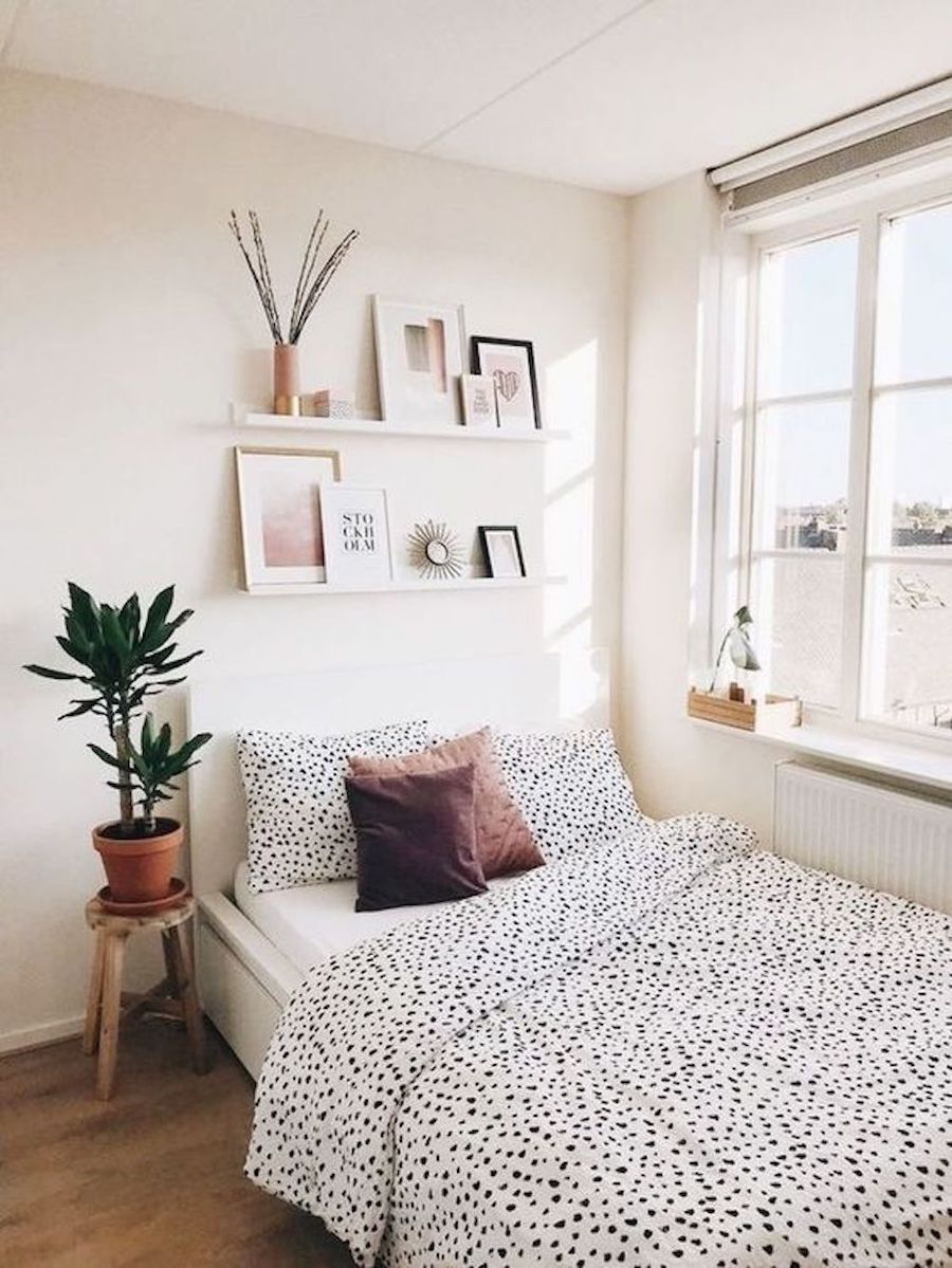Last, on our list of dorm room ideas, this little bedroom has a minimal and serene vibe with white linens, a deep brown throw blanket, and simple art.