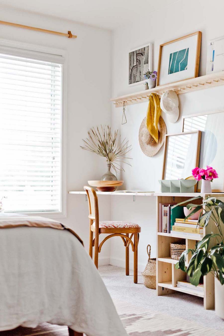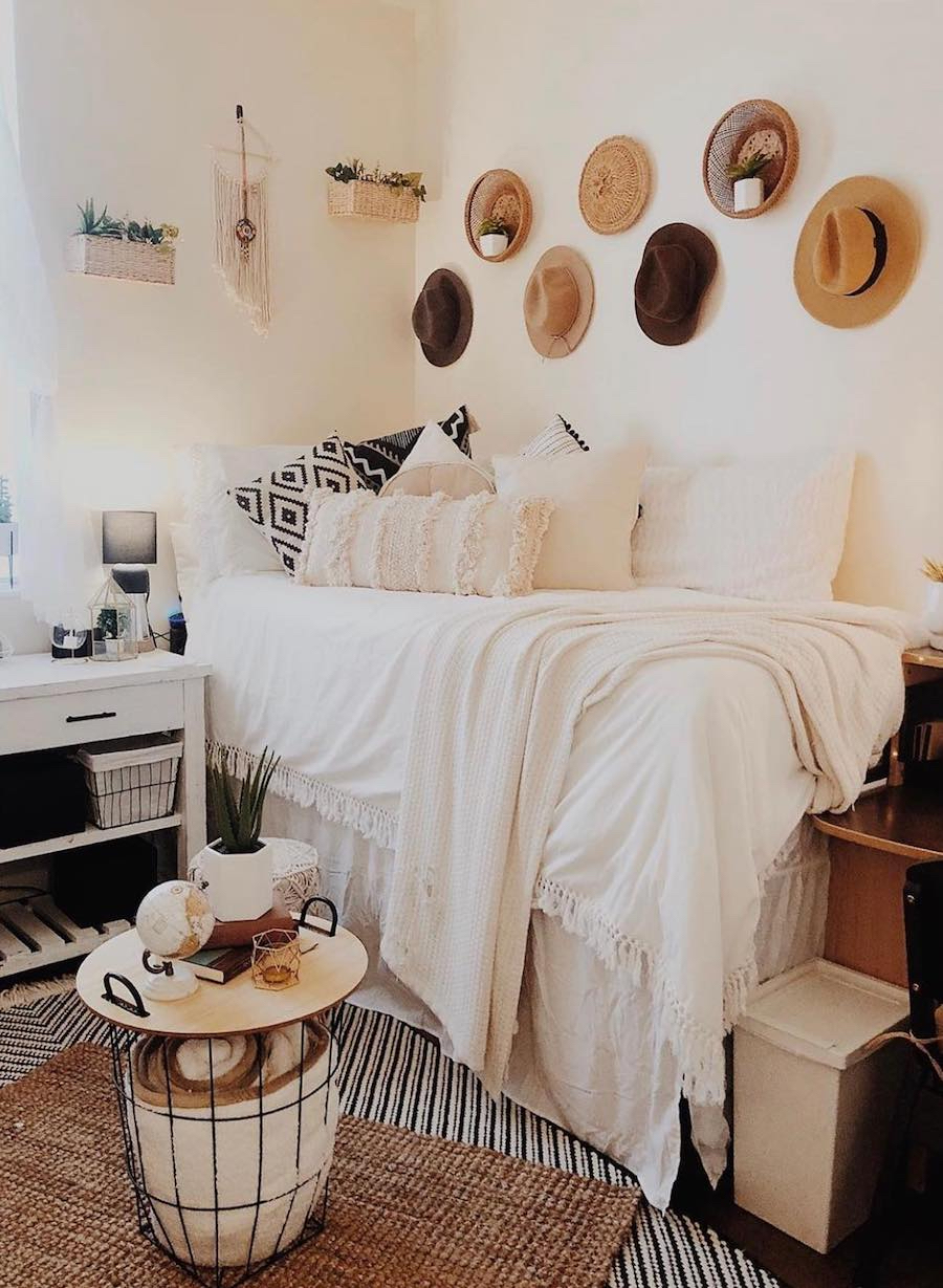 This next dorm room has put hats to good use to give the space a boho aesthetic. We love the idea of hanging your favorite fedoras on the wall as a focal feature and adding in more boho decor with wicker, pillows, and a seagrass rug.