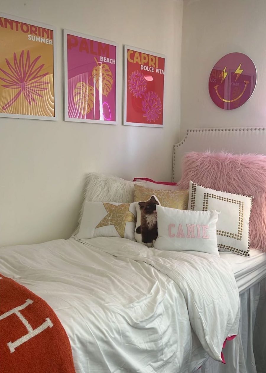 If a wall collage isn’t your thing, keep it simple with a cute trio of framed prints above your bed. We love the subtle pops of pink in this dorm room and the big faux fur pillow!