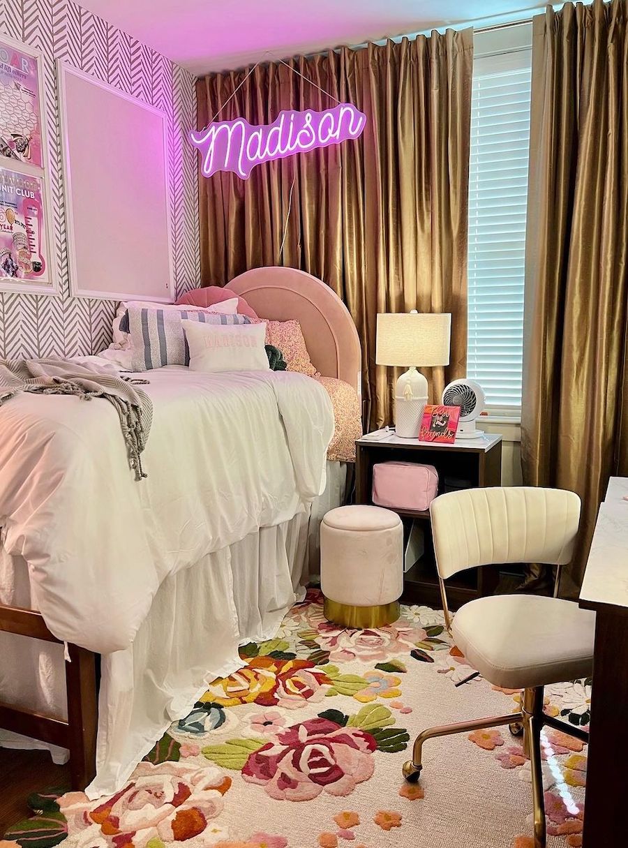One of the more popular dorm room decor trends is a neon light sign, and we can see why! This cute decor addition adds a fun vibe to this space and is perfect for someone who loves to have fun!