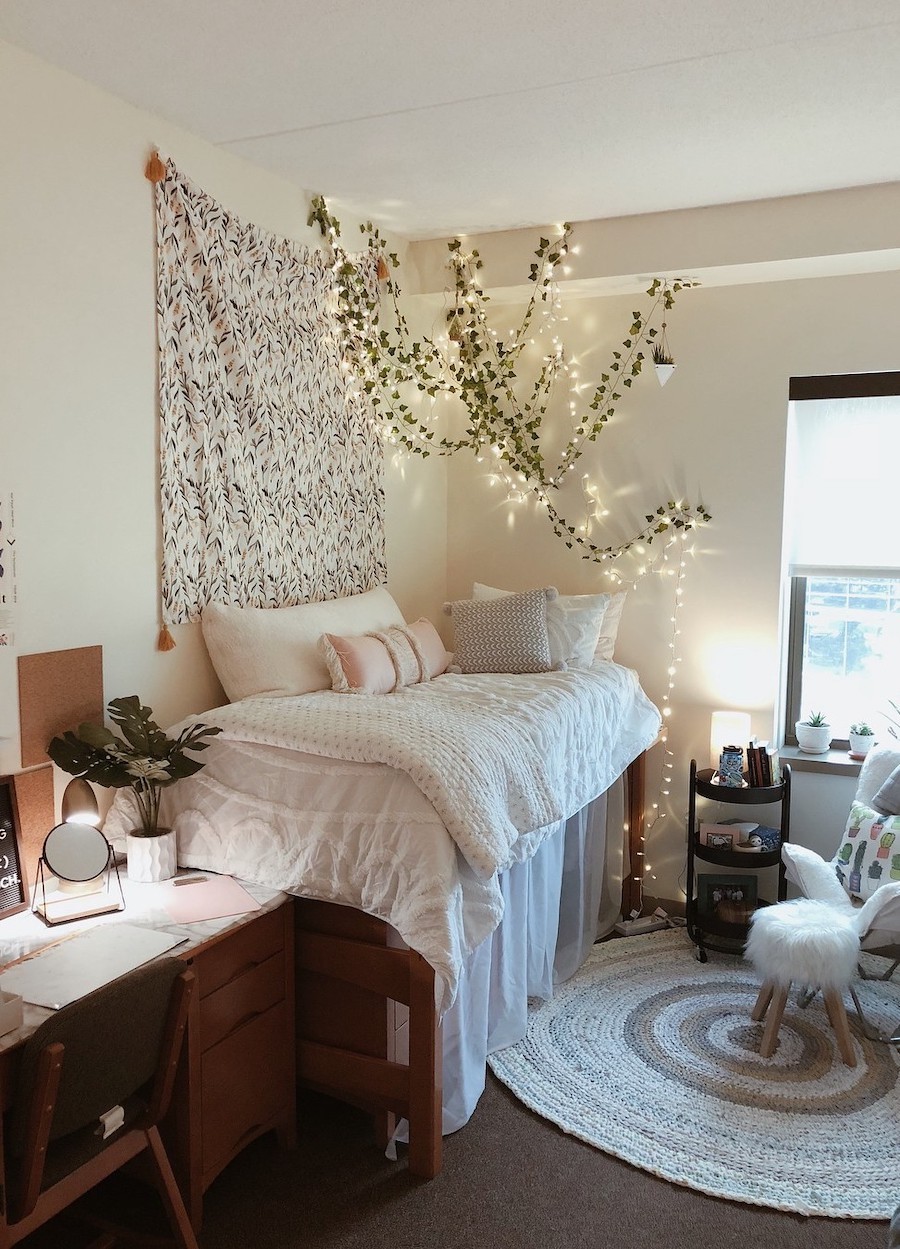 There’s something about string lights and hanging vines that make a space feel instantly whimsical and this dorm room is no exception.