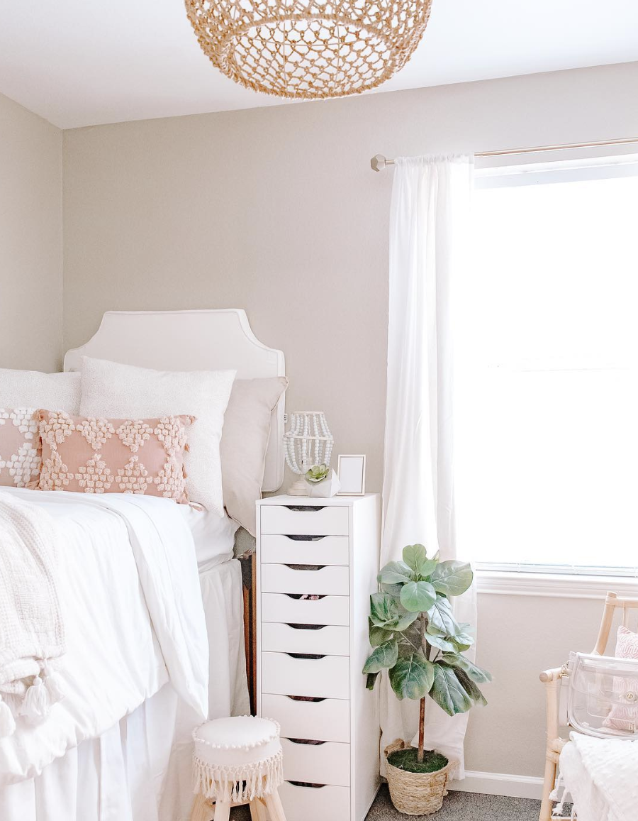 This cute and feminine dorm room combines a lot of white with boho touches like wicker, fringe, and pops of pink. Adding a hanging wicker pendant over your room light can elevate the whole space, even if you can’t switch out your whole light fixture!