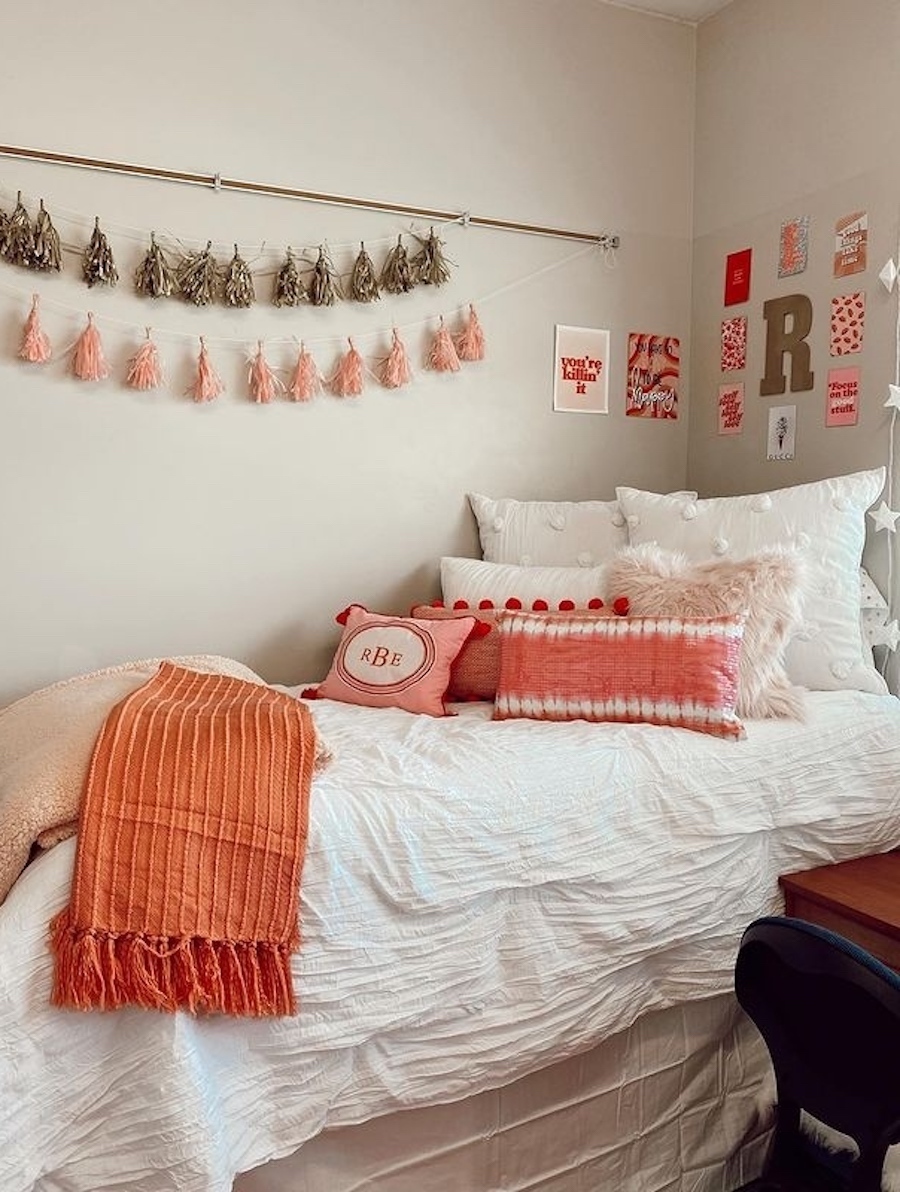 Take inspiration from the dorm room above and dress up your walls with cute tassel garlands. We love the use of fun pillows, a small collage, and the garland for an easy way to personalize your dorm space.