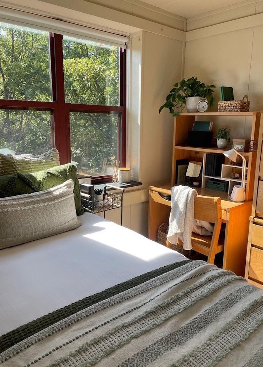 Give your dorm room a cozy feel with earthy linens, pops of green, and plant babies. This space feels calming and inviting, a perfect place to lounge after a long day of classes and exams!