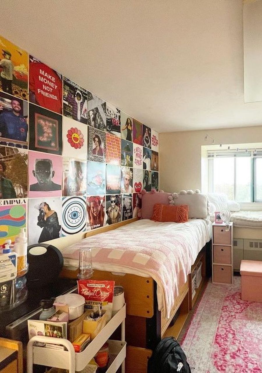 One of the easiest ways to personalize your dorm room and make a statement is with a poster collage. We love the uniform look of this dorm room wall where all the posters are the same size.