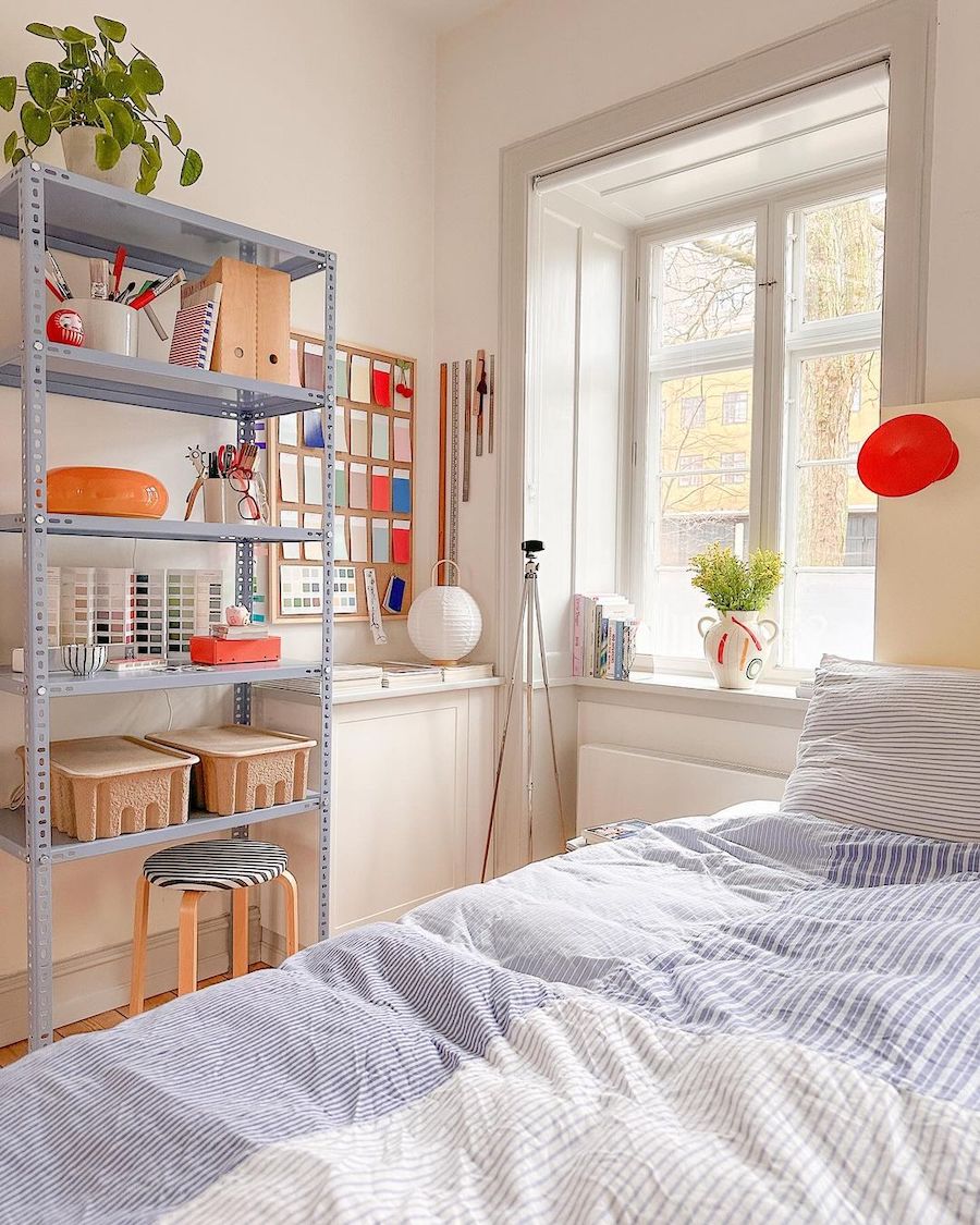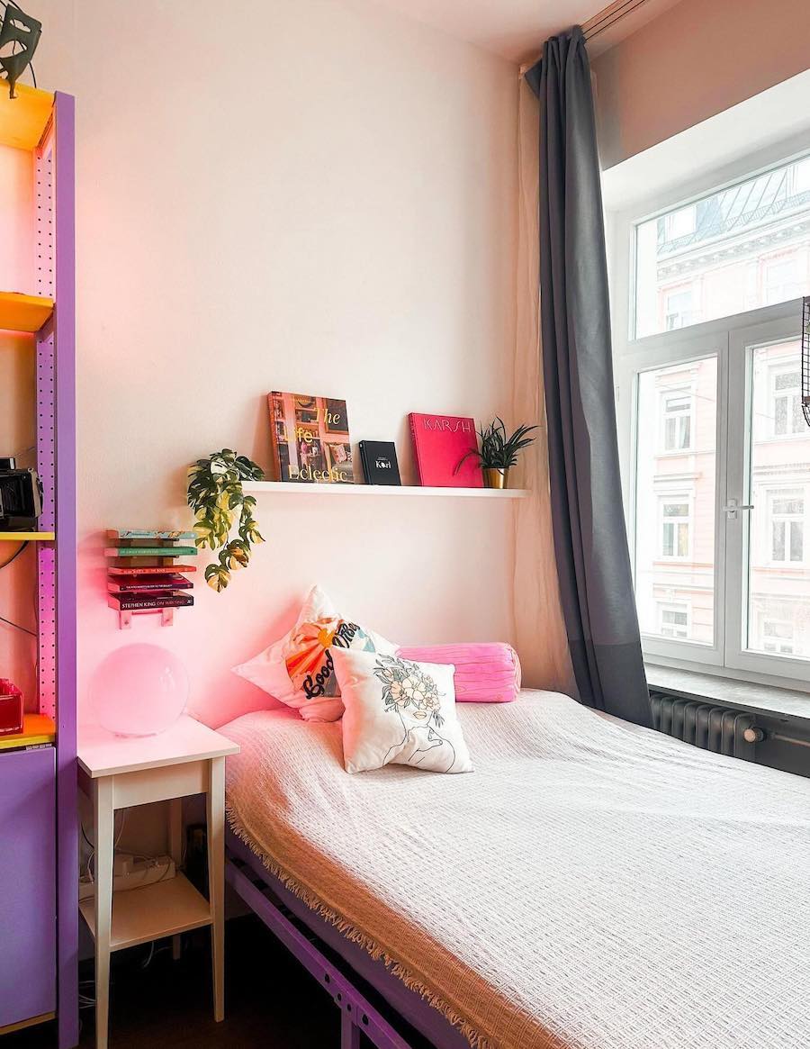 This super cute dorm room shows how you can easily keep your space feeling minimal and clean while adding pops of personality with a feature shelf and color-changing globe light.