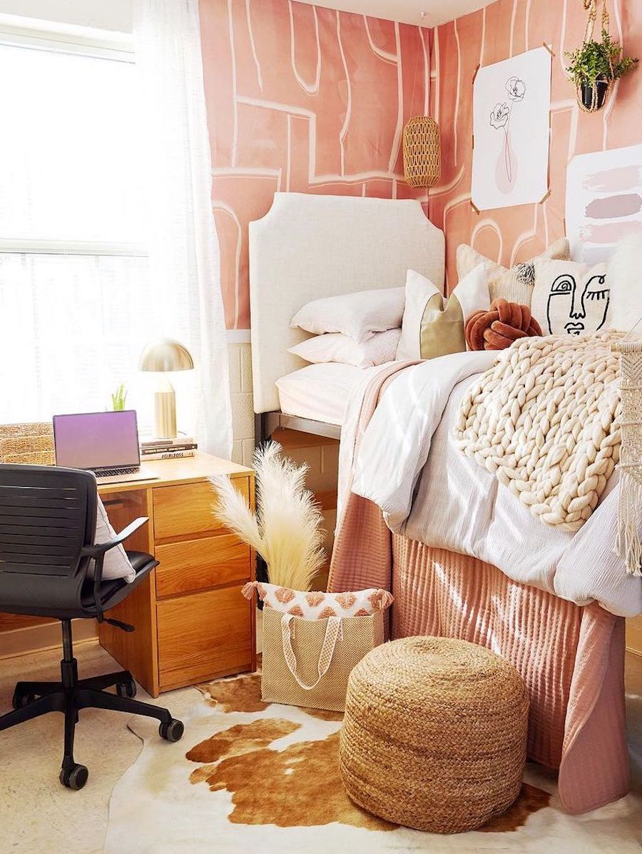 While you can’t plaster real wallpaper on your dorm room wall, you can decorate with pictures and hanging art. Take inspiration from this dorm with a large pink boho peel-and-stick mural that goes from the ceiling to the middle of the wall (and is removable!).