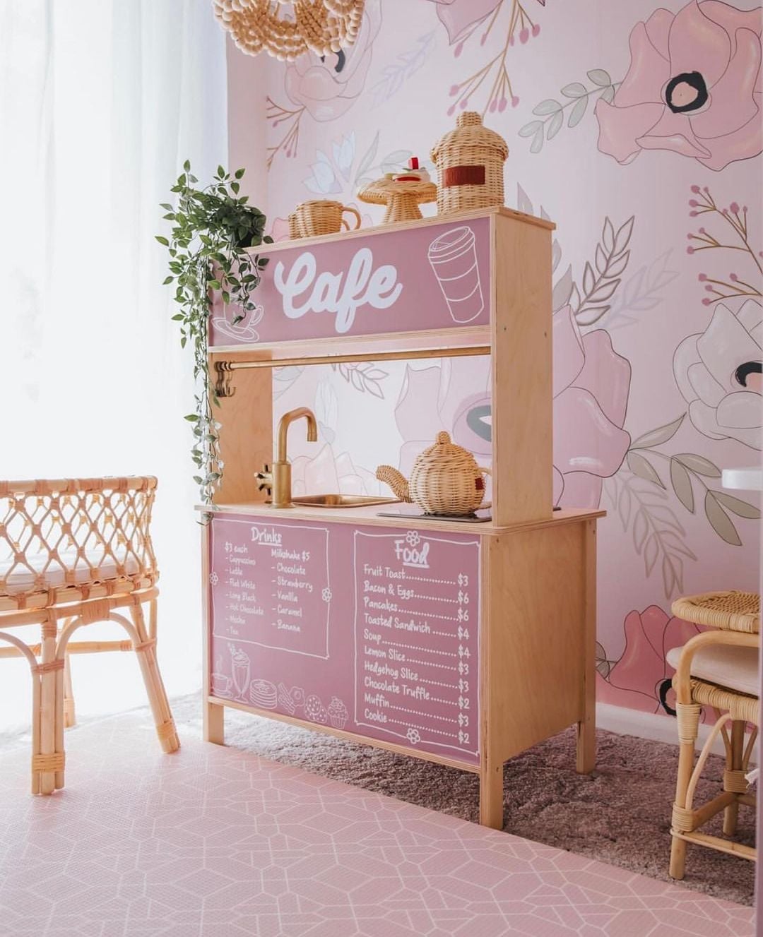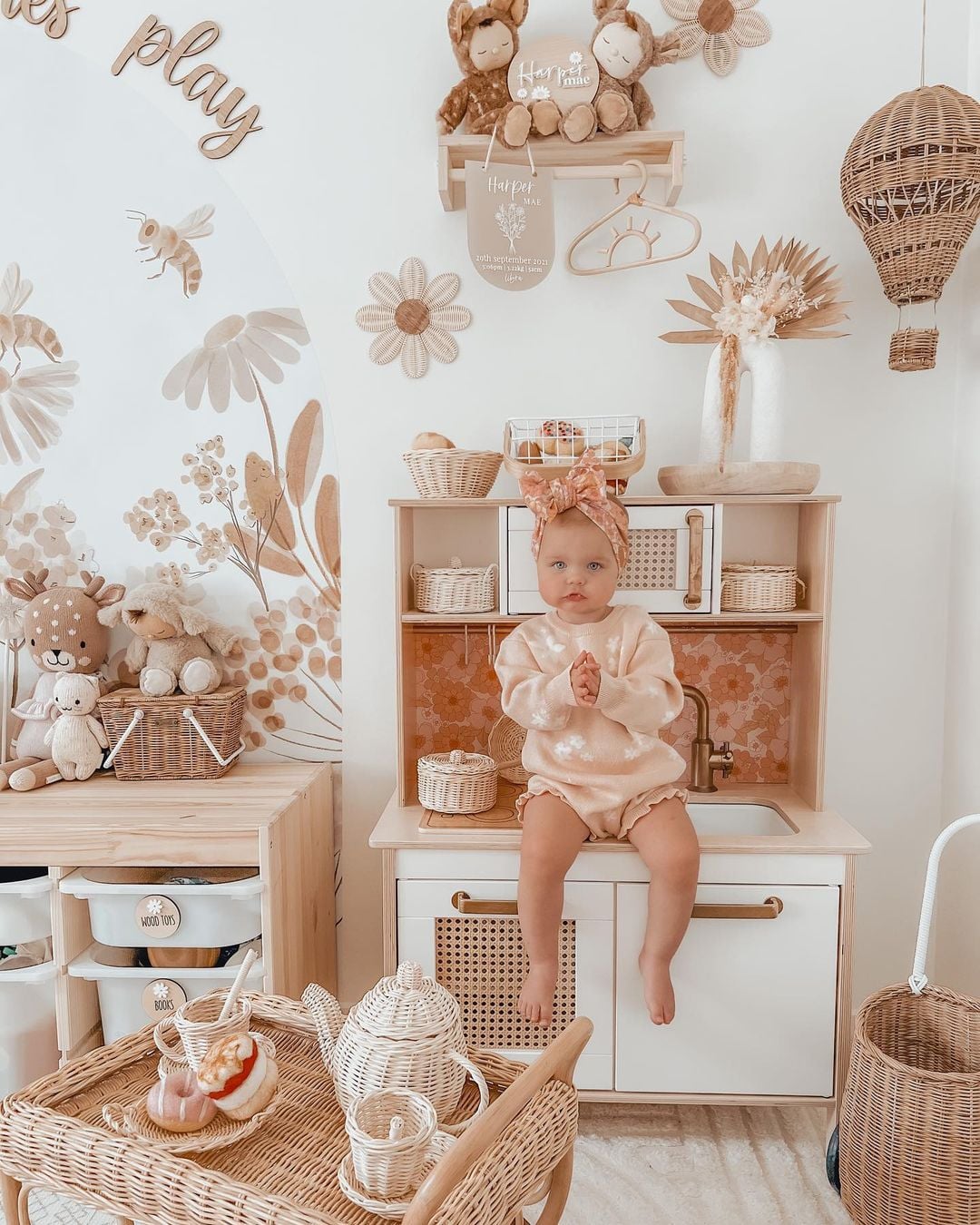 We love how there are several different floral accents that complement the chosen color palette of blush and beige. Rattan baskets, a rolling cart, and play accessories are the icing on this cute Ikea Duktig upgrade cake.