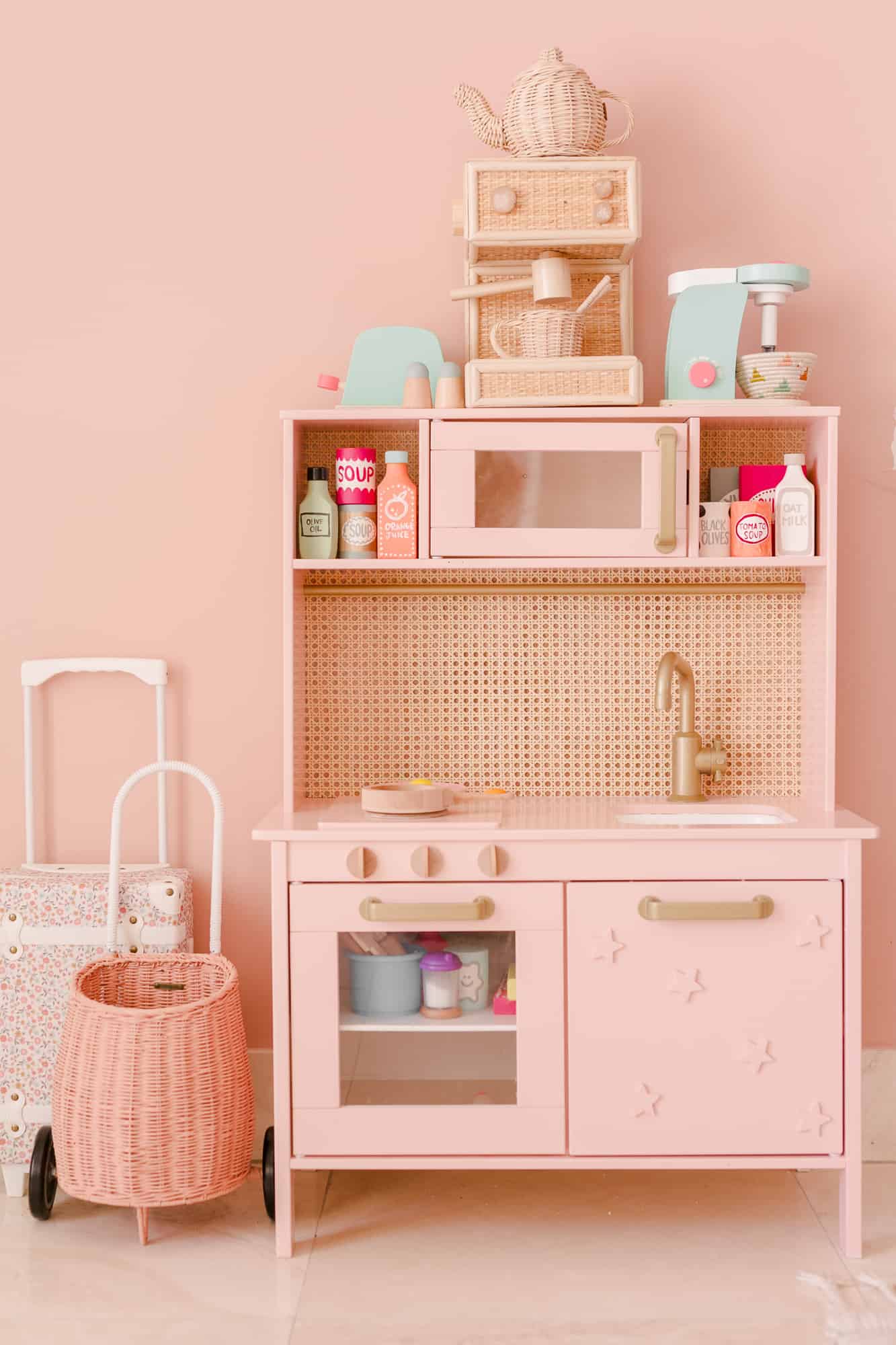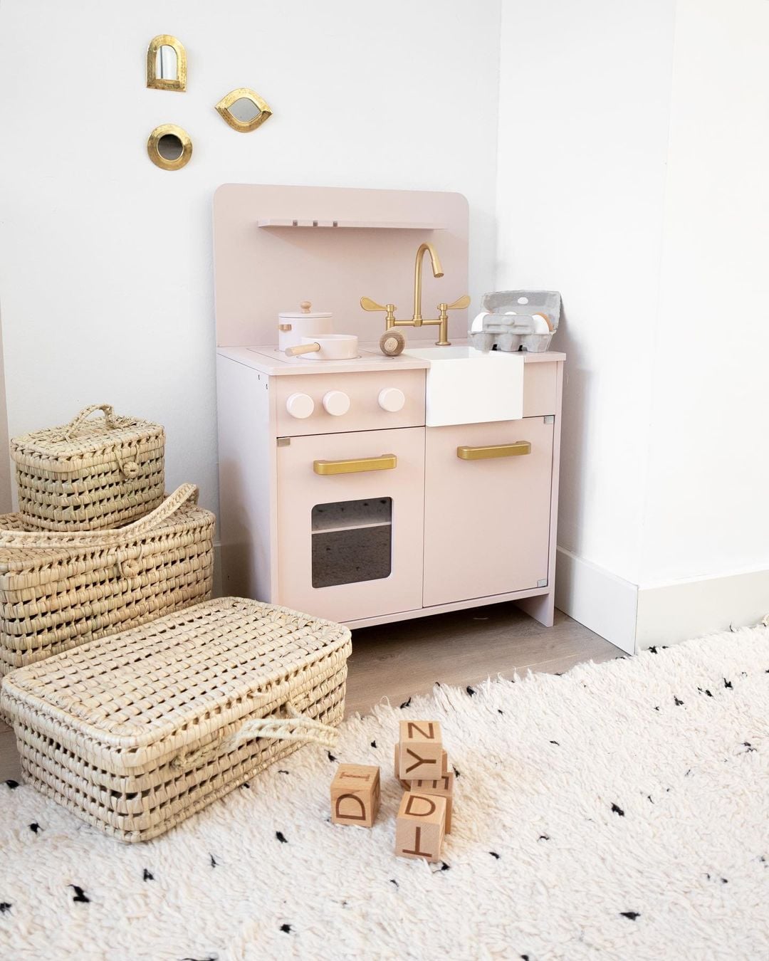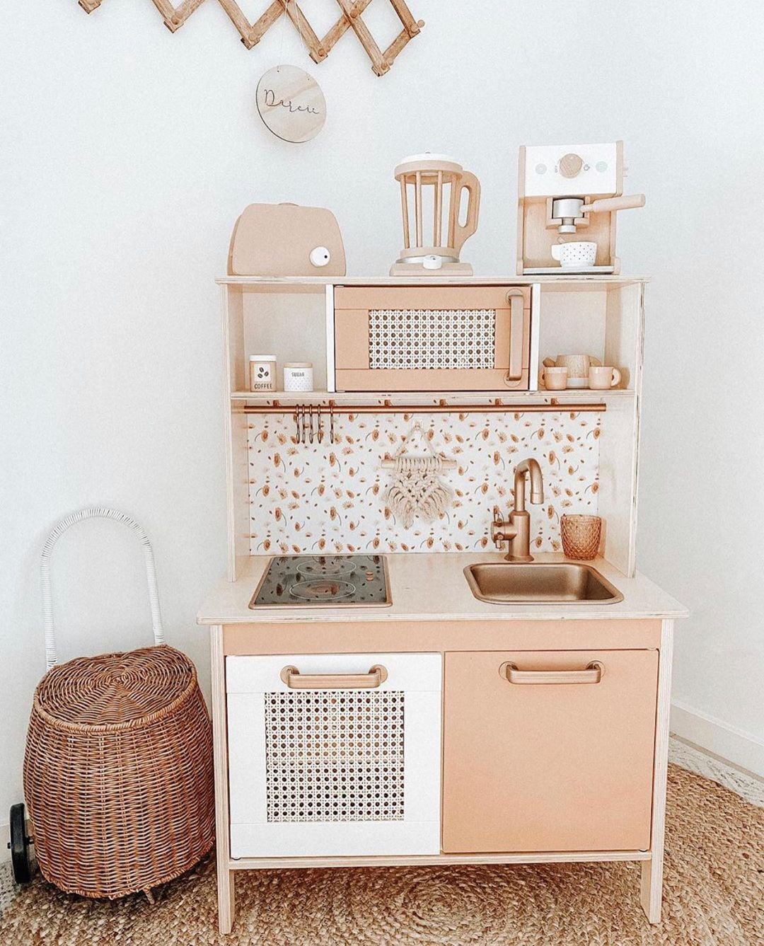 The peel-and-stick backsplash on this next play kitchen offers a boho flair and complements the blush pink and white paint. We love the addition of a rattan basket, small wooden toy appliances, and a cane detail on the oven front.