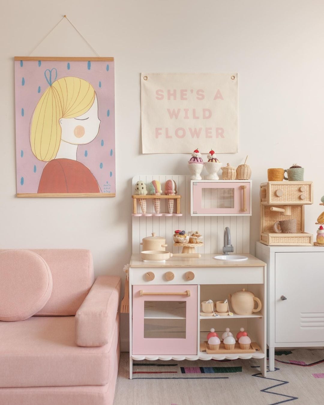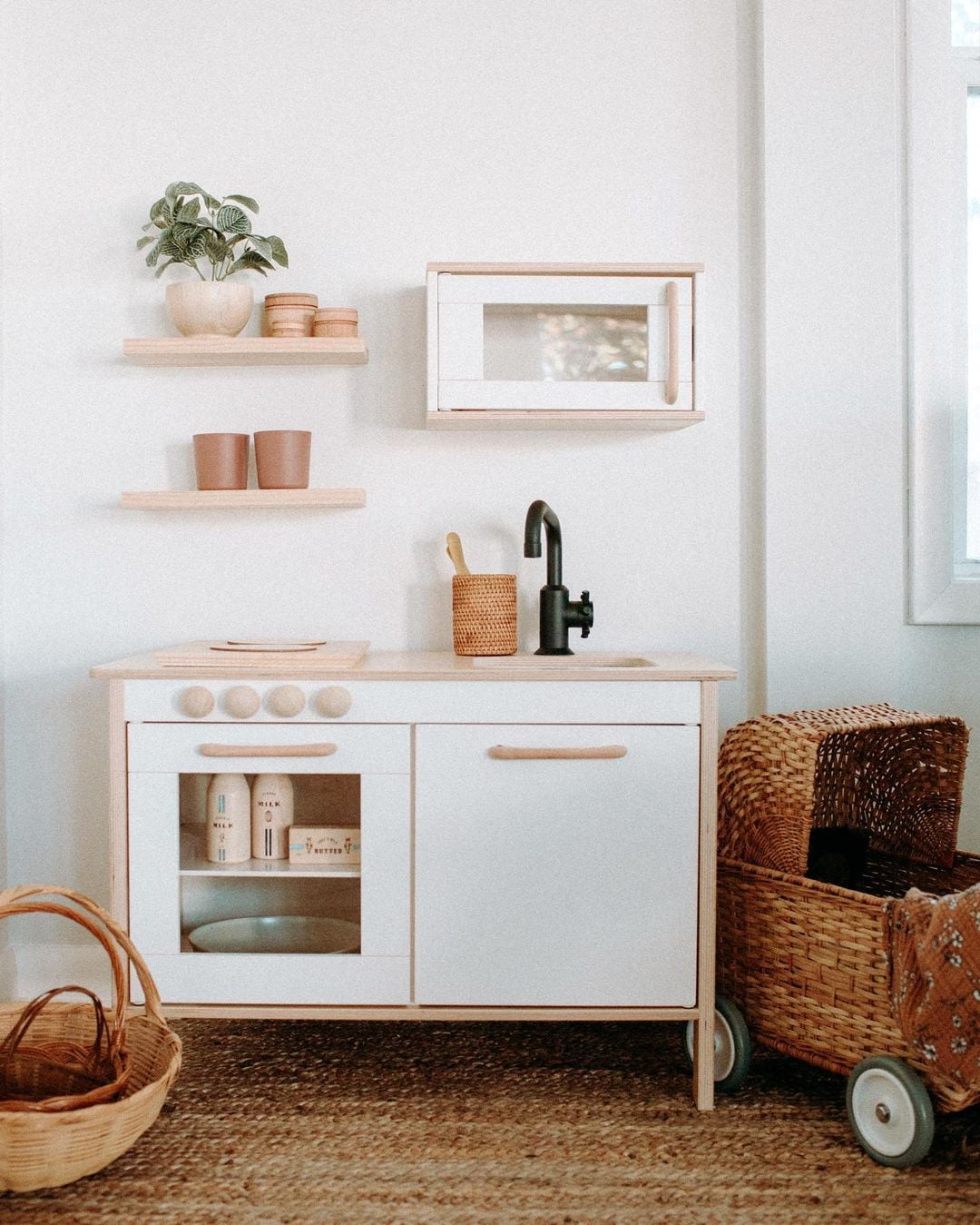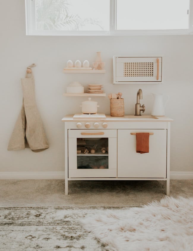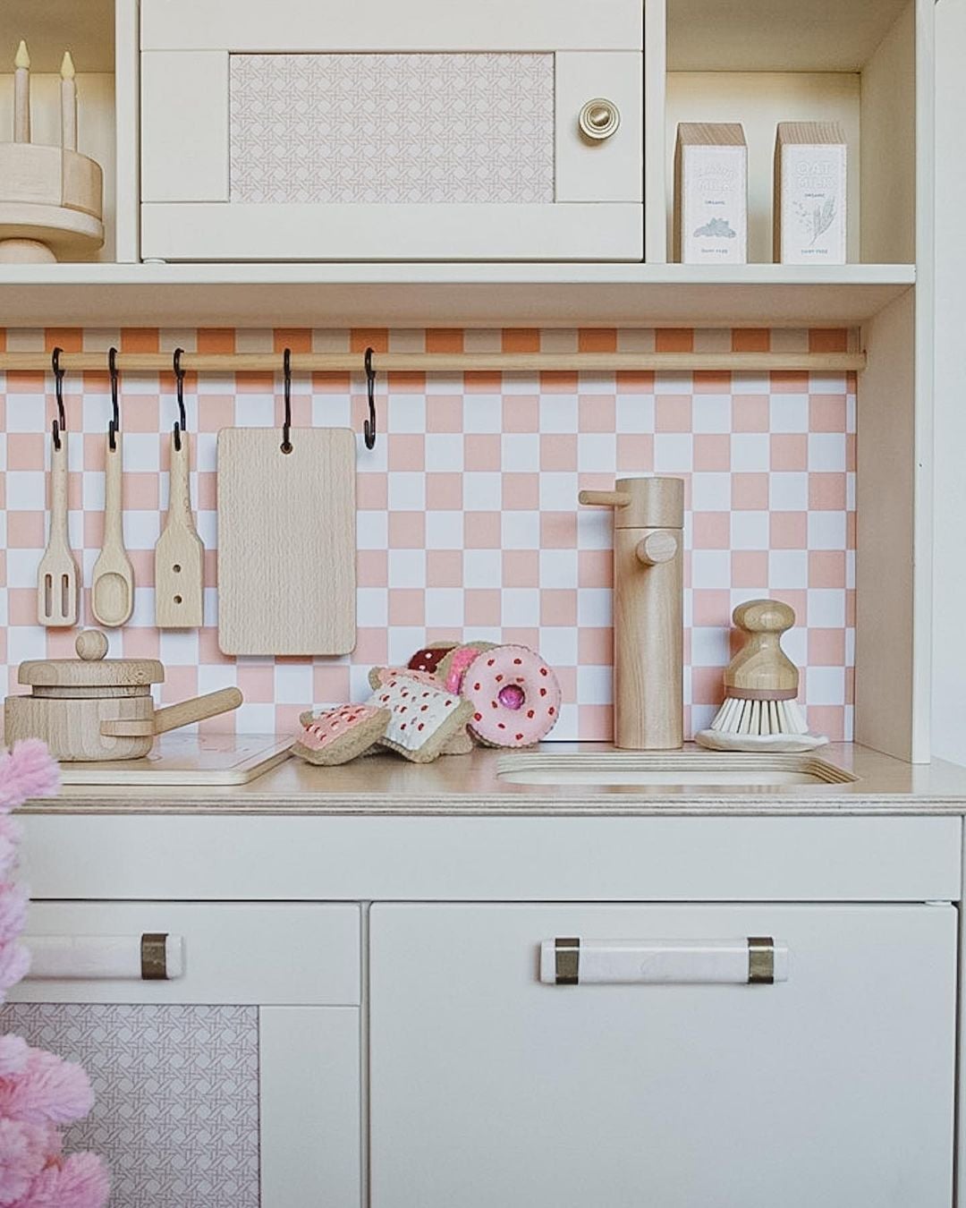 The peel-and-stick backsplash on this next play kitchen offers a boho flair and complements the blush pink and white paint. We love the addition of a rattan basket, small wooden toy appliances, and a cane detail on the oven front.