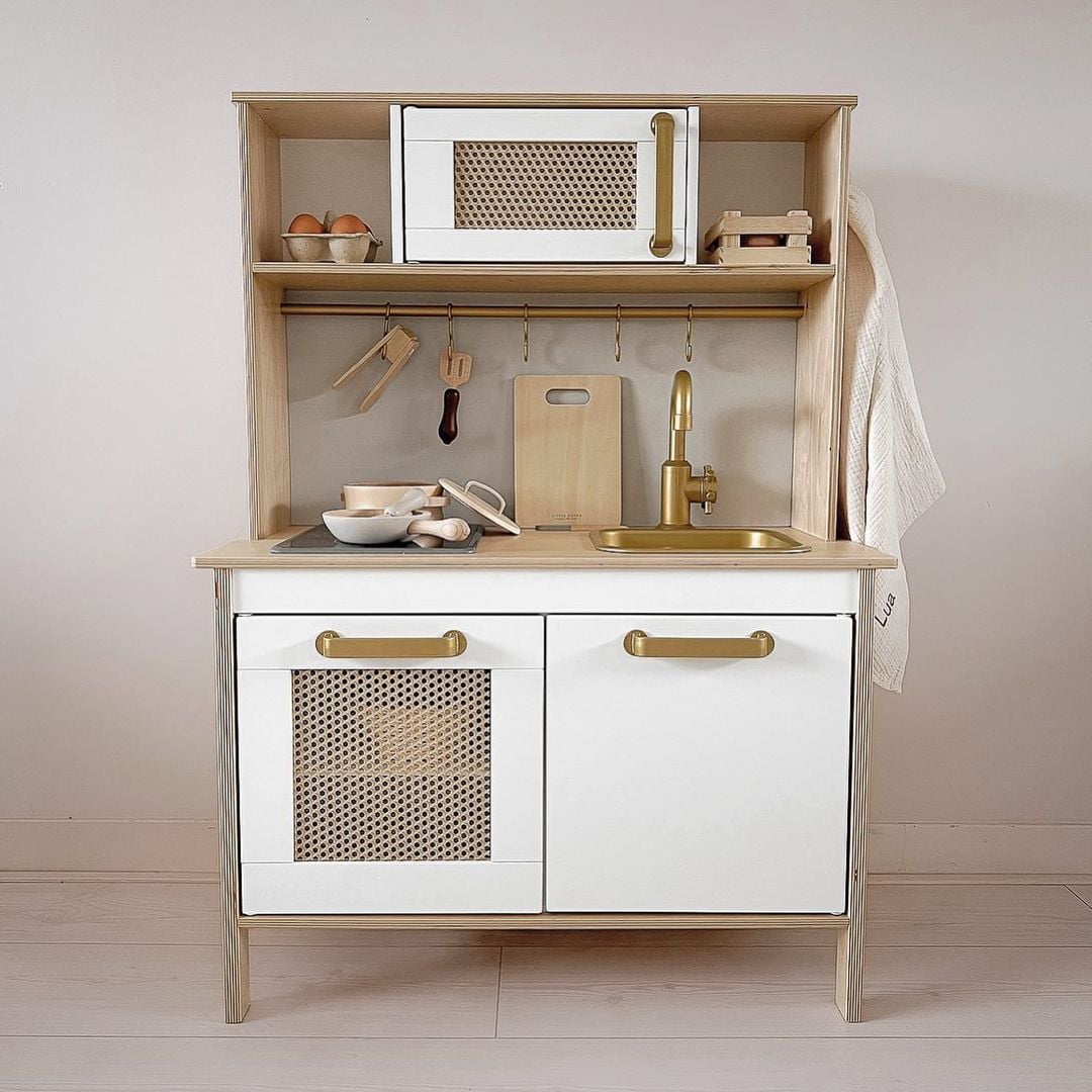 White and gold give this next kitchen a glamorous vibe, perfect if your little one is a little extra! A can of non-toxic spray paint can easily turn the tap, sink, and handles into shimmering gold hardware that is still perfect for play.
