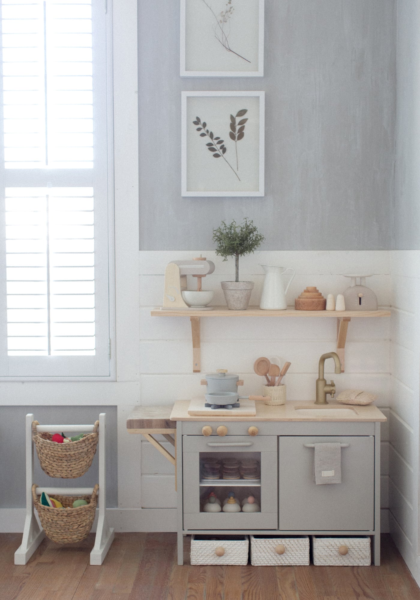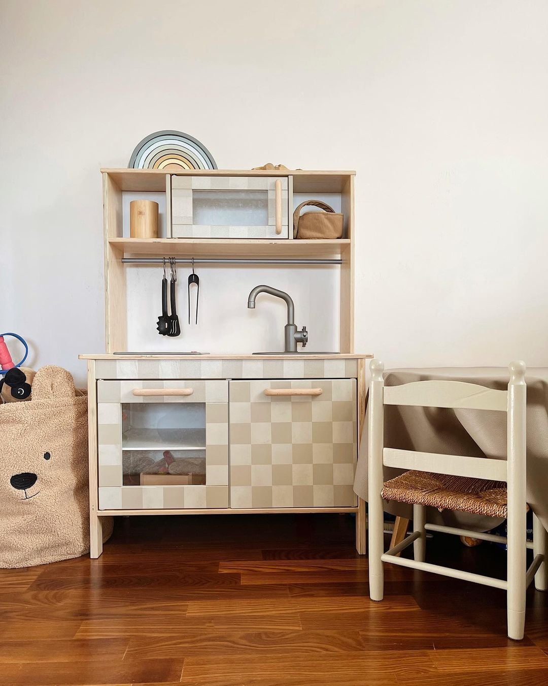 Sometimes all you need is a little checkered print to make a space stand out. For this kitchen set, a taupe and white checker print is the star and goes perfectly with a little side table and furry bear toy bin.