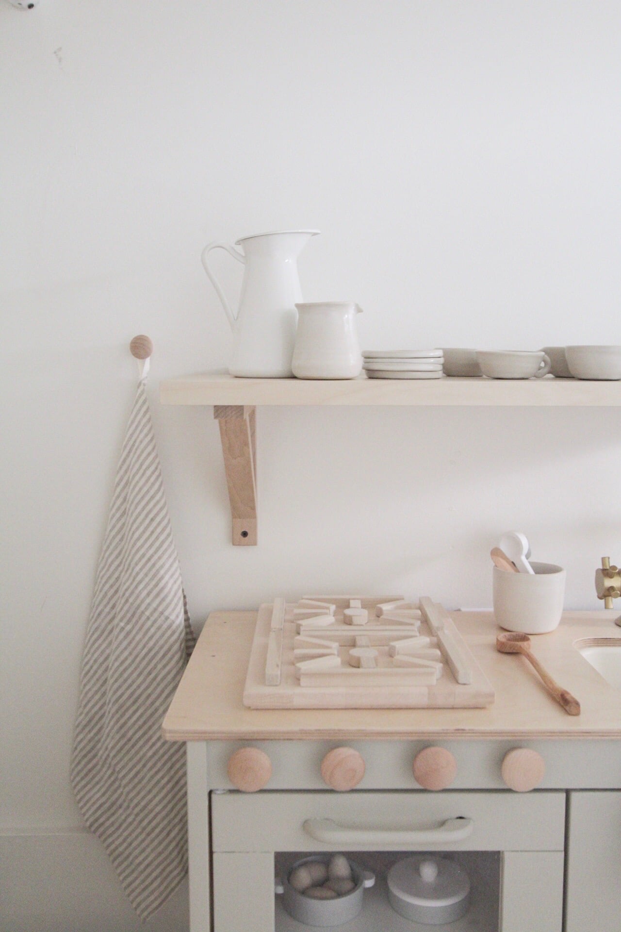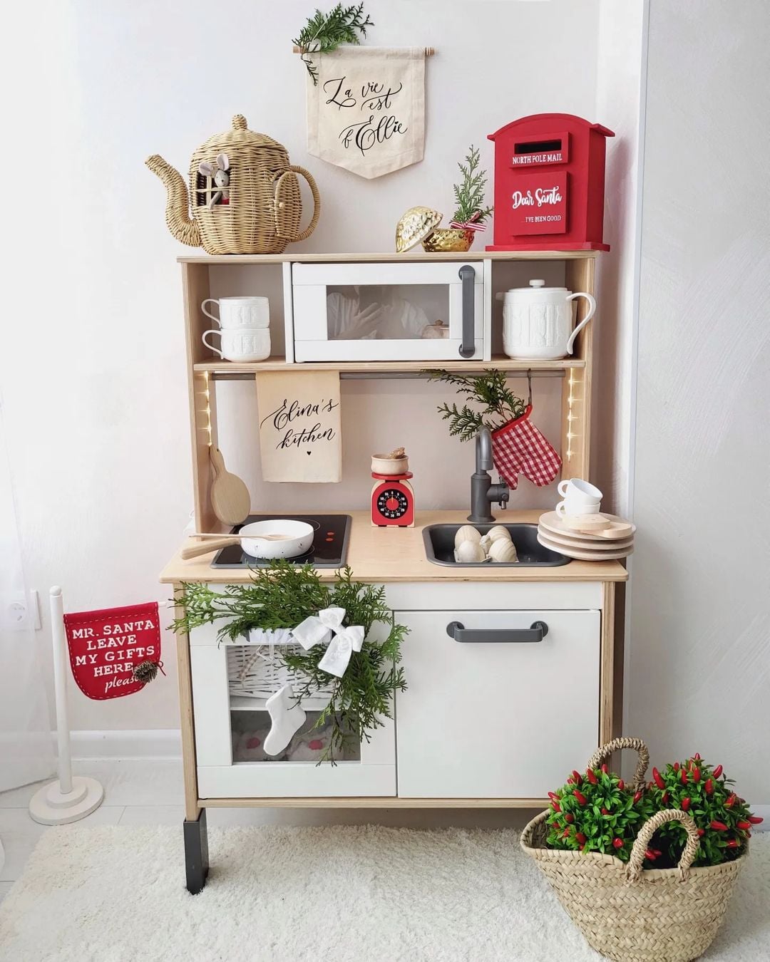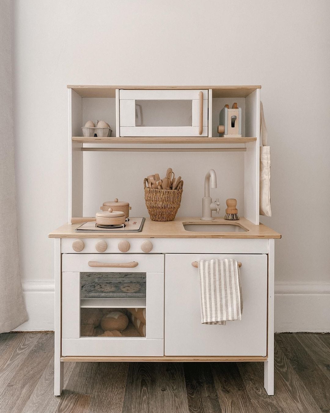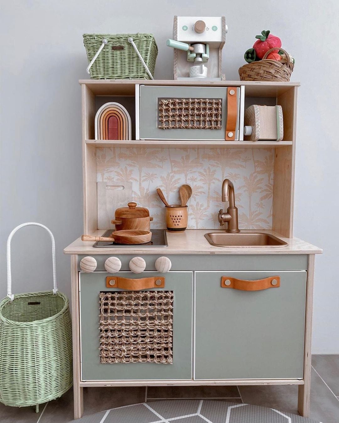 If you want to give your kiddo a realistic experience with cooking on a “gas stove,” then you’ll love this Ikea Duktig kitchen hack by Thimble & Cloth. She not only nailed it with a pretty sage and ivory color scheme but also with the wooden stovetop addition.