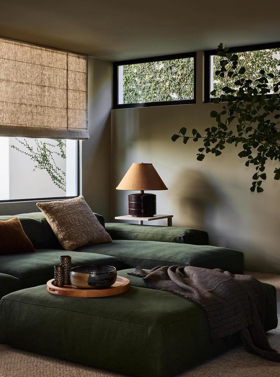 This timeless and sophisticated forest green instantly adds earthy appeal. The oversized couch creates a plush spot to relax in, while the soft lighting, wood tones, and towering tree finish the space.