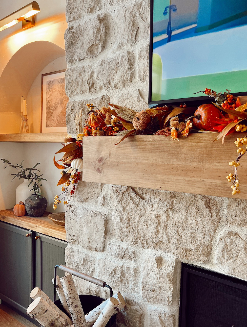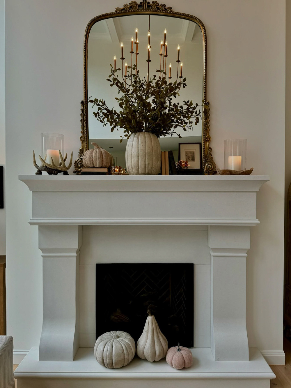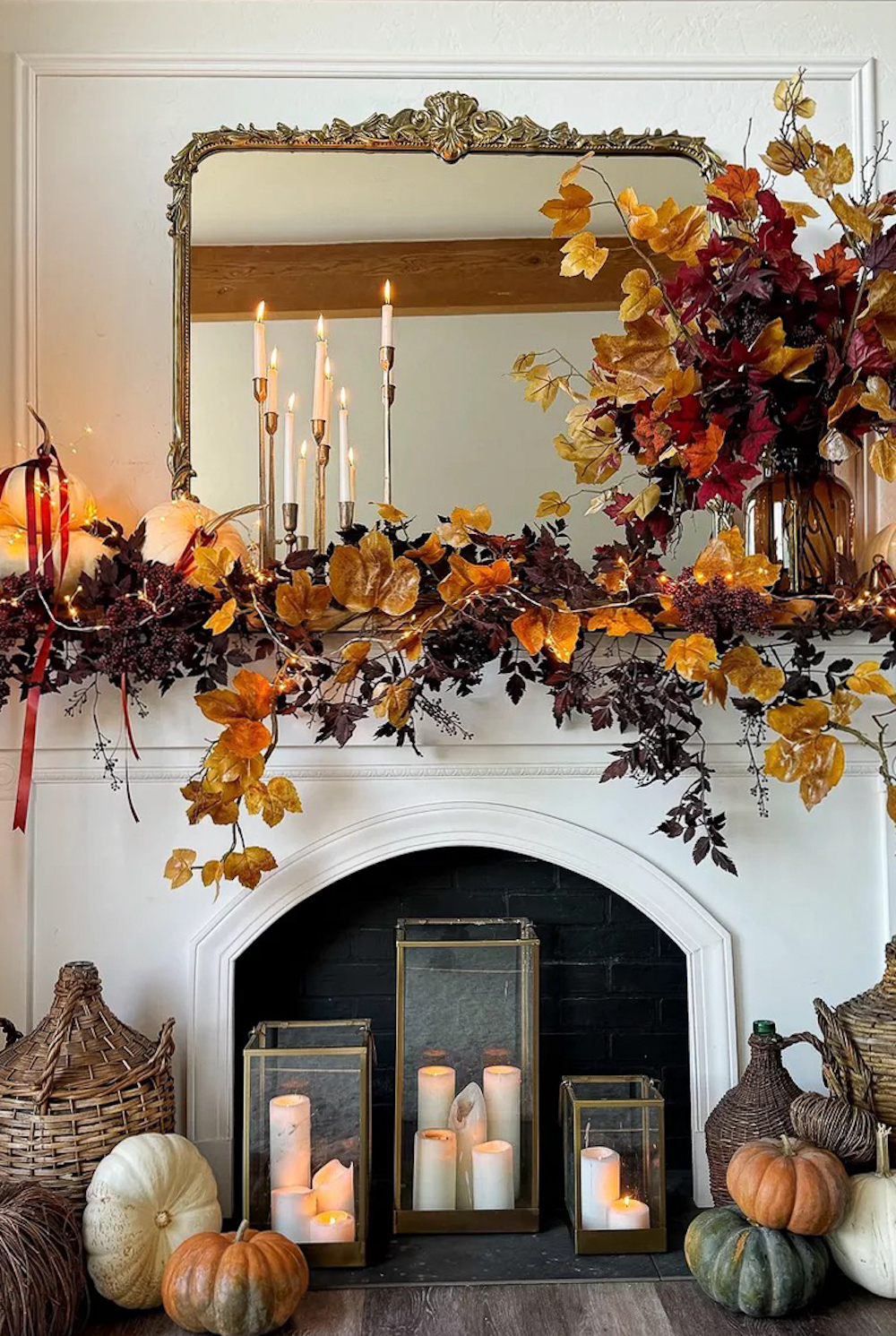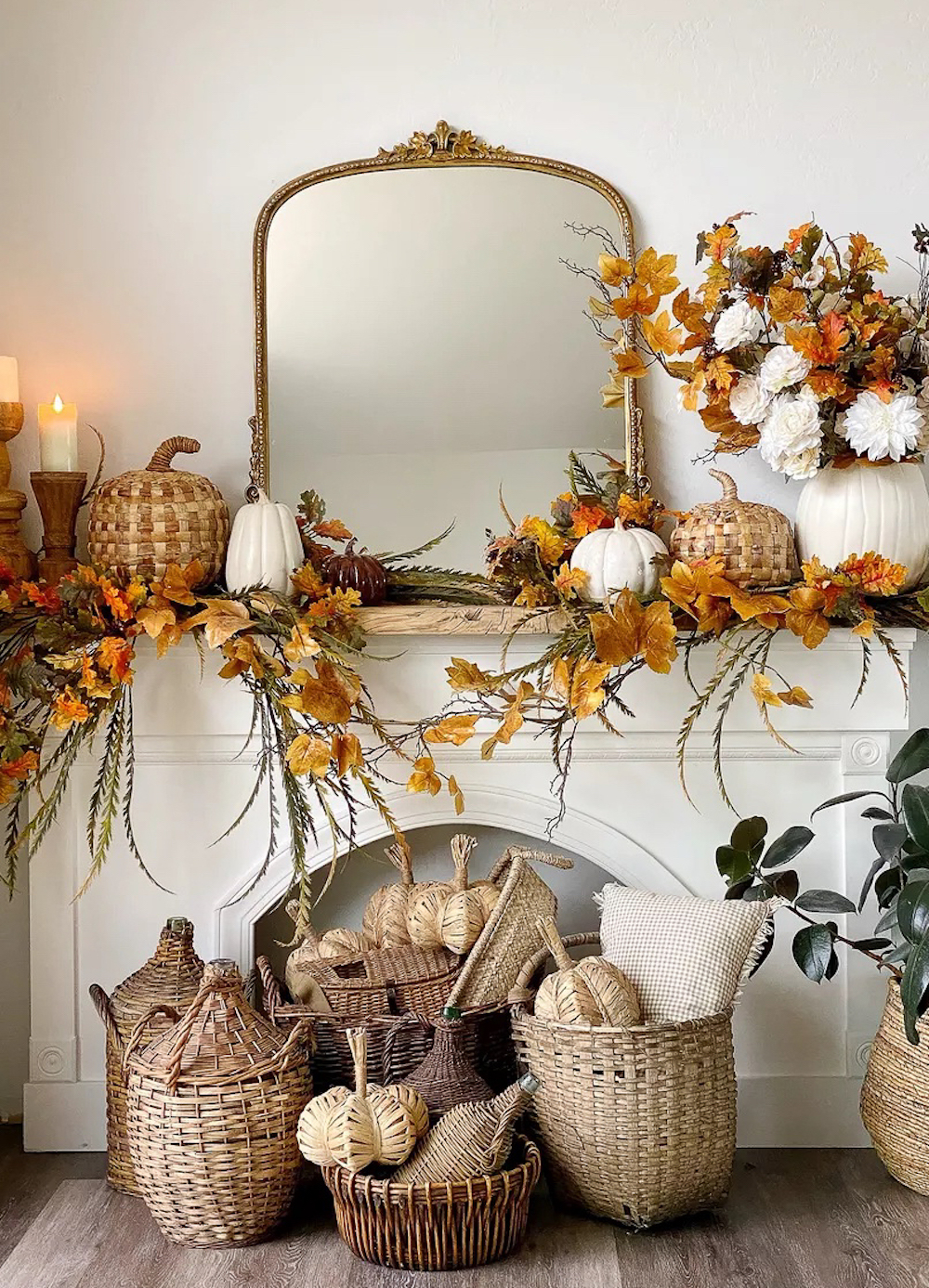 Elevate the look by adding pumpkins, candles, and wicker accent pieces for timeless fall fireplace decor. You can also recreate the look above by weaving twinkle lights through the garland for a whimsical appeal.