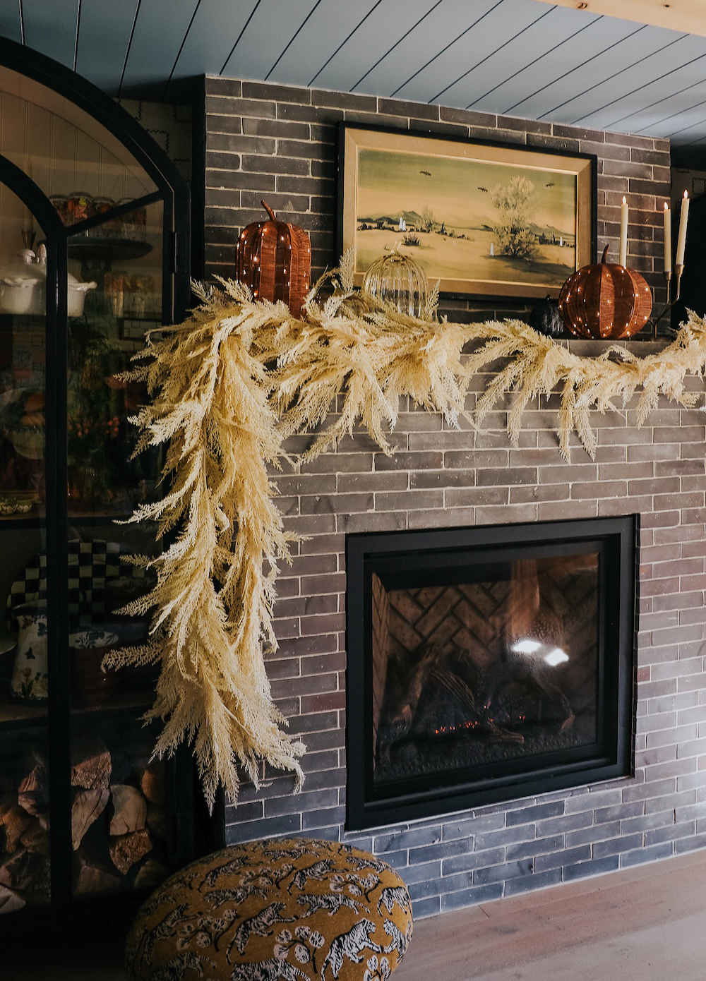 Pampas grass has been a decor staple in homes for years—and this element works well for an autumn aesthetic. Offering a subtle boho vibe, the feathery, neural leaves pair perfectly with other fall elements and add a bright touch to the dark-toned brick along the fireplace.