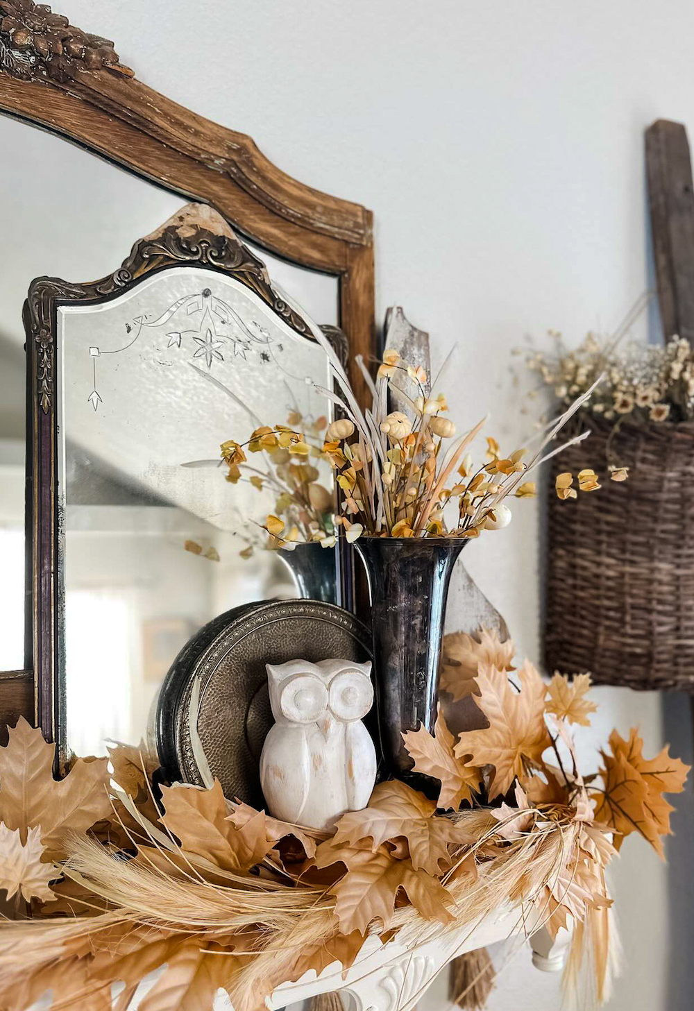 Select mirrors with ornate gold or wooden frames for an understated elegance, and create depth by adding dried leaves and other fall decor in front of them.