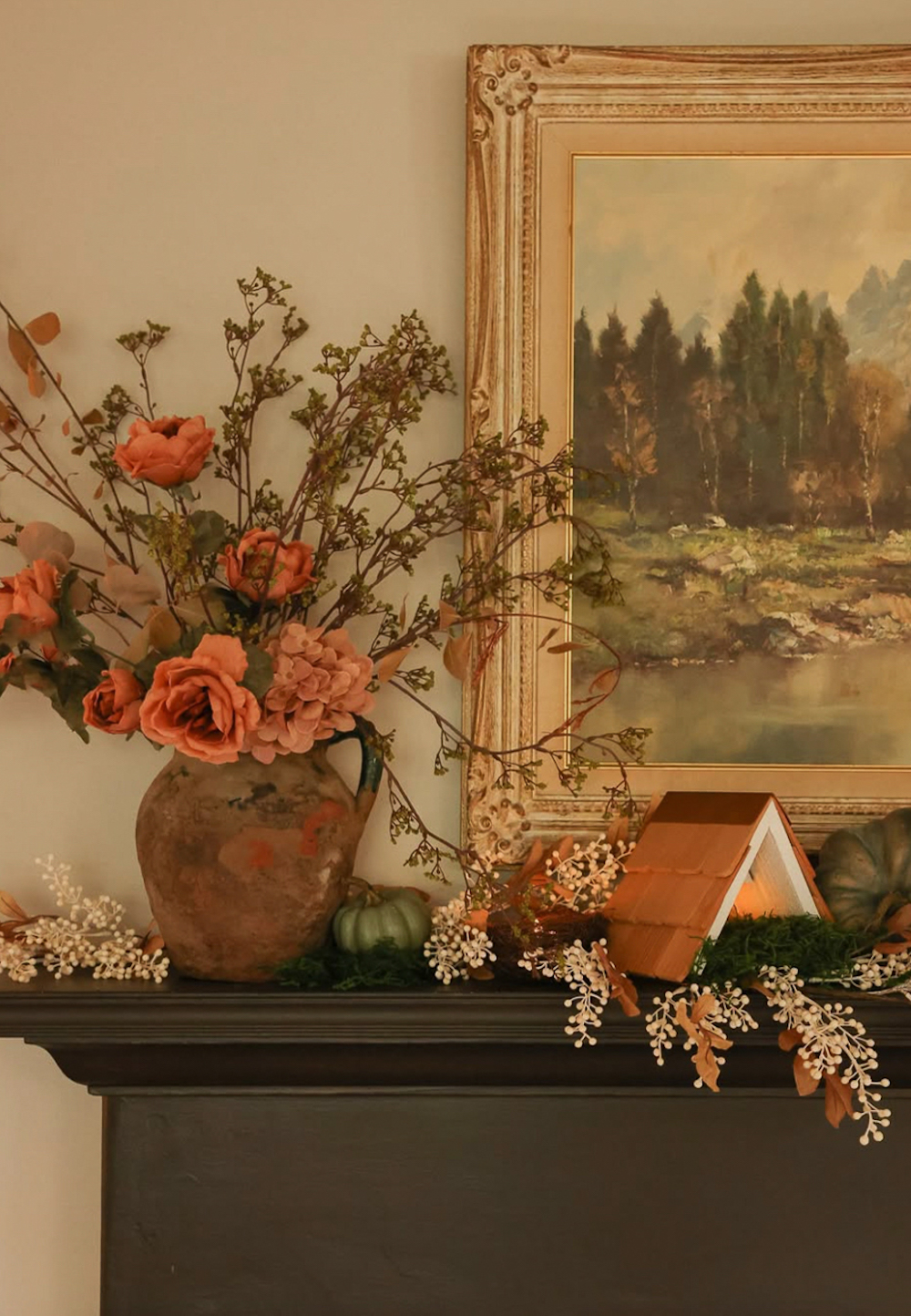 Embrace a soft, feminine aesthetic with rosy blooms, ornate golden framed art, and dainty ivory berries. These elements add sophistication and femininity, creating a mantle that’s both whimsical and refined.
