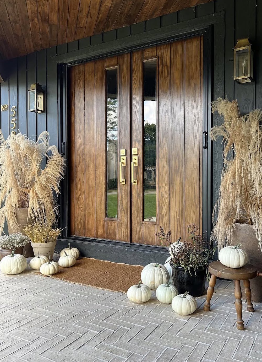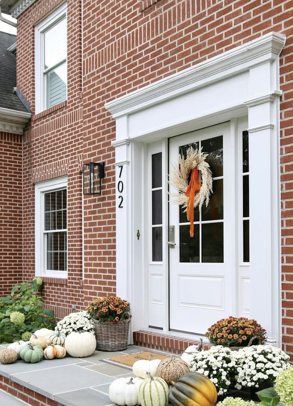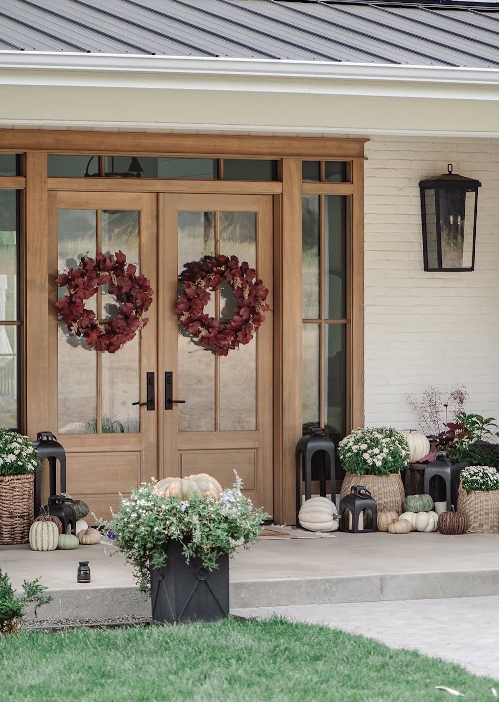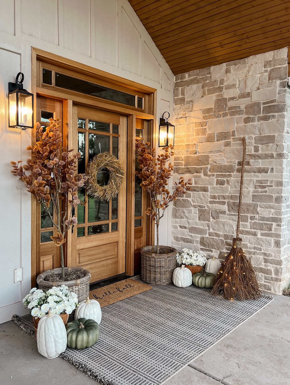 You can incorporate these colors through potted plants, trees, garlands, or wreaths. These details add that quintessential fall feeling to your front porch.