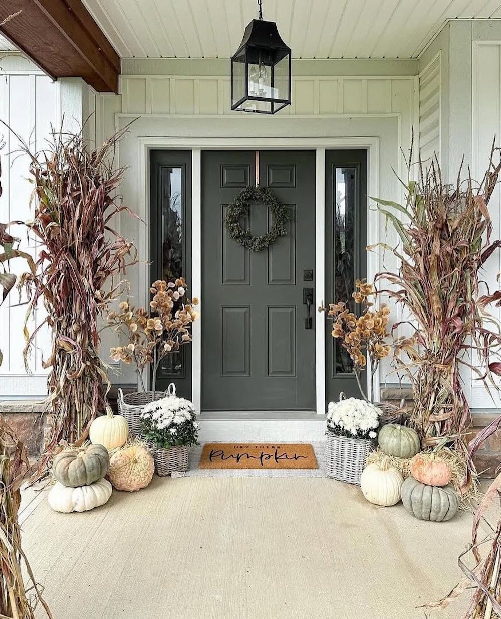 Bundle cornstalks together with twine and line your front door and walkway with them. These rustic outdoor decorations work well as the backdrop for pumpkins, florals, and baskets for a subtle farmhouse vibe.