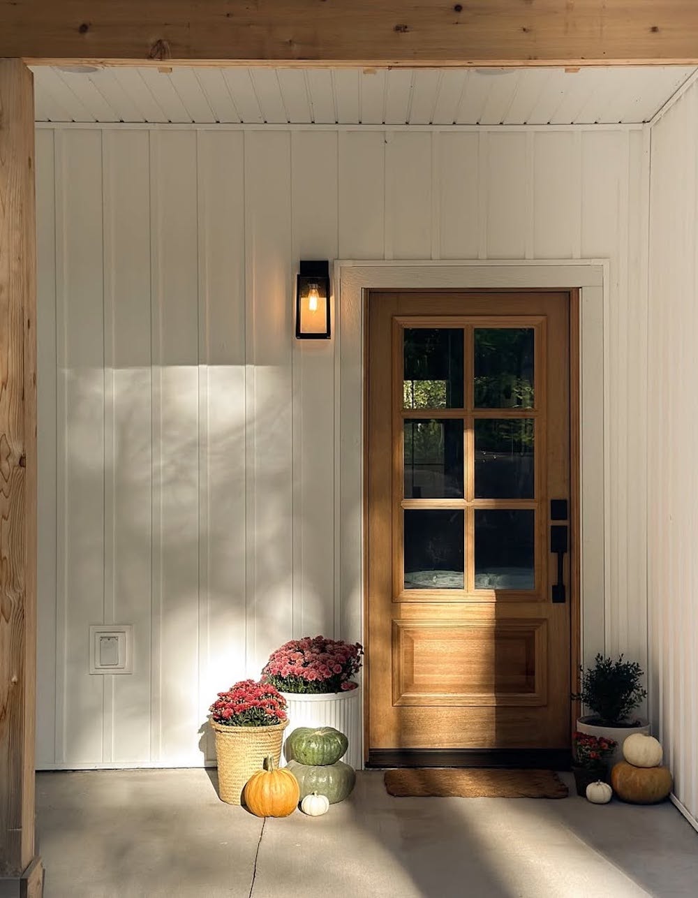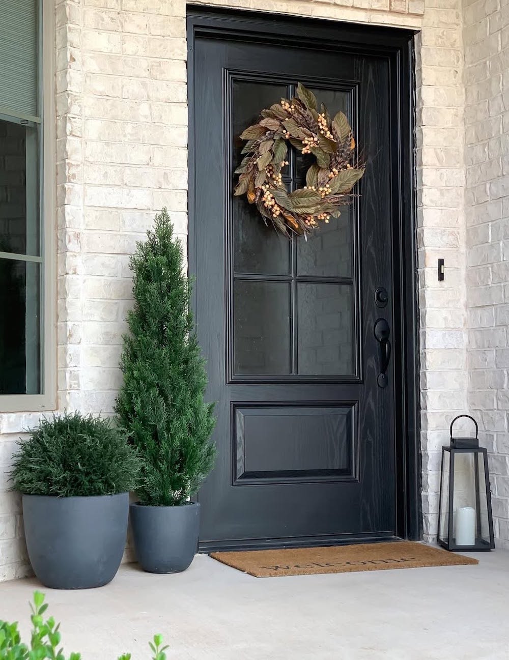 If you want a more obvious fall look, add a pumpkin or two in front of either the planters or the lantern. However, as all minimalists know, less is often more. And this understated approach to fall porch decor creates an elegant and effortless statement.