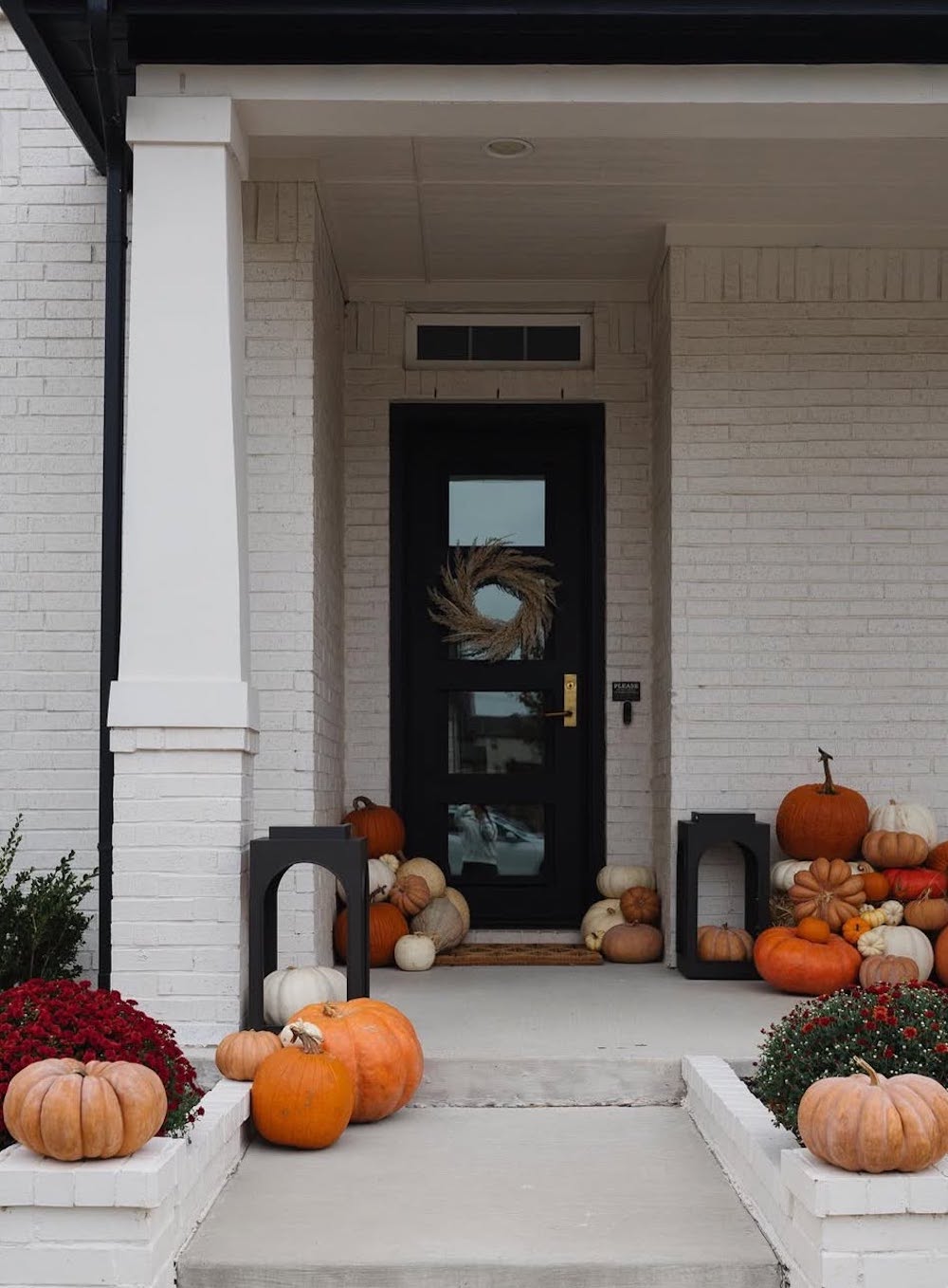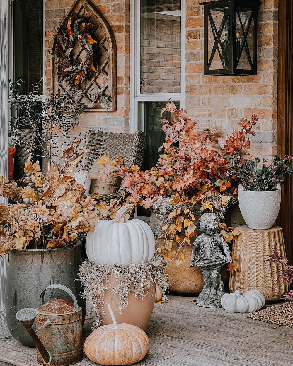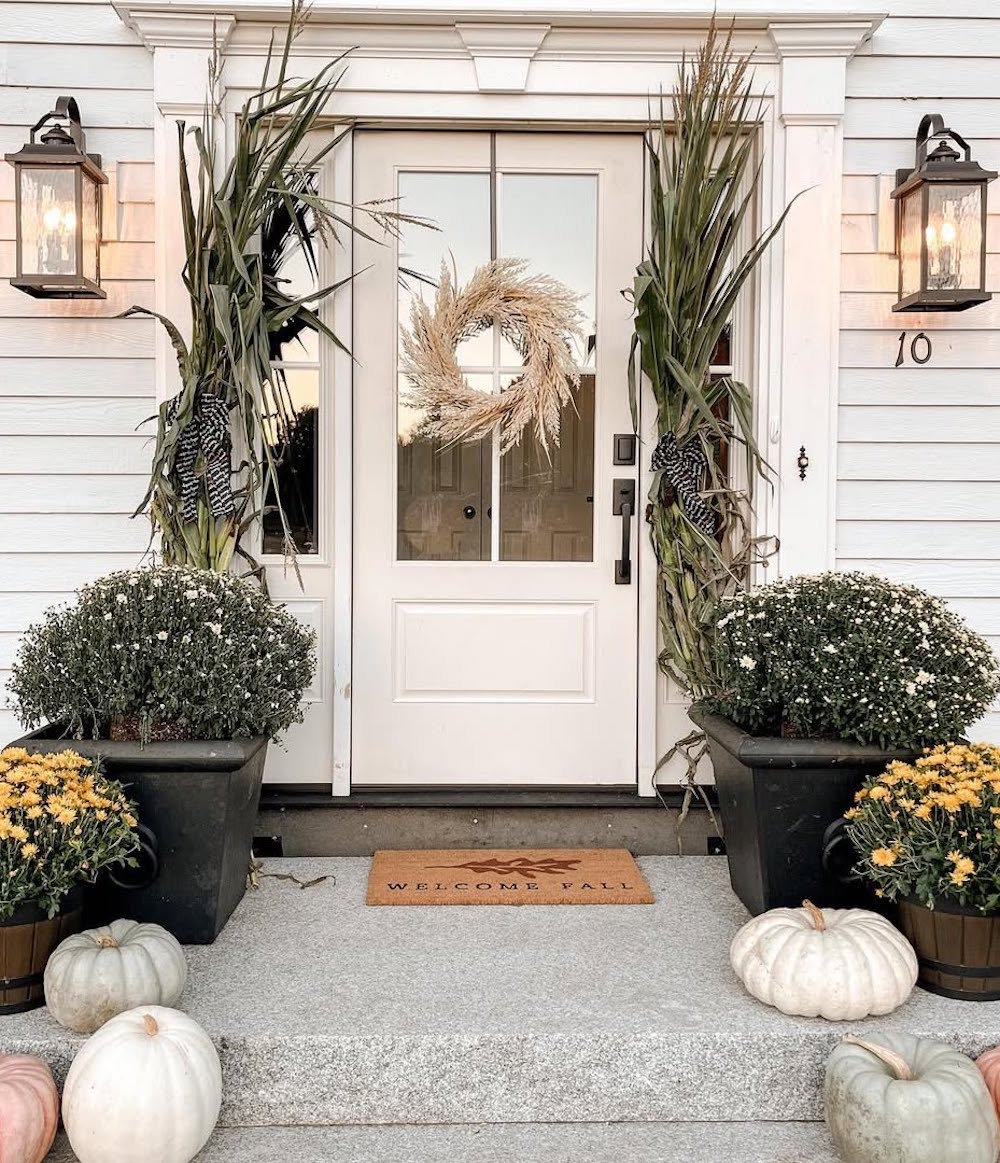 Lean into bright, crisp autumn decor with pops of ivory. These beautifully contrast the traditional, warm fall colors and brighten up the porch.