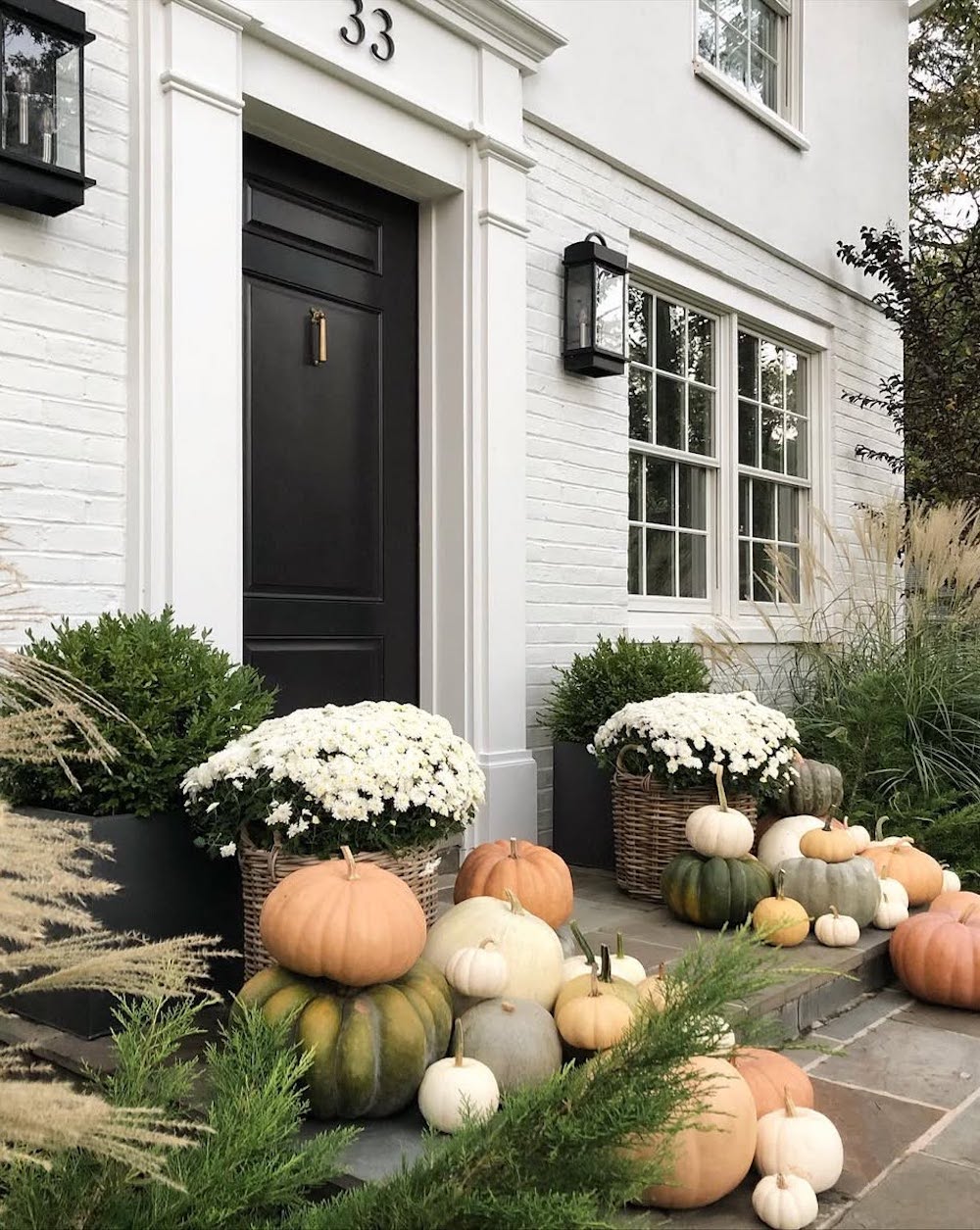 Add a white wooden chair, which can double as extra space to stack pumpkins and gourds. Complete the look with white pumpkins and flowers, bringing a light and airy feel and elegant allure to your porch.