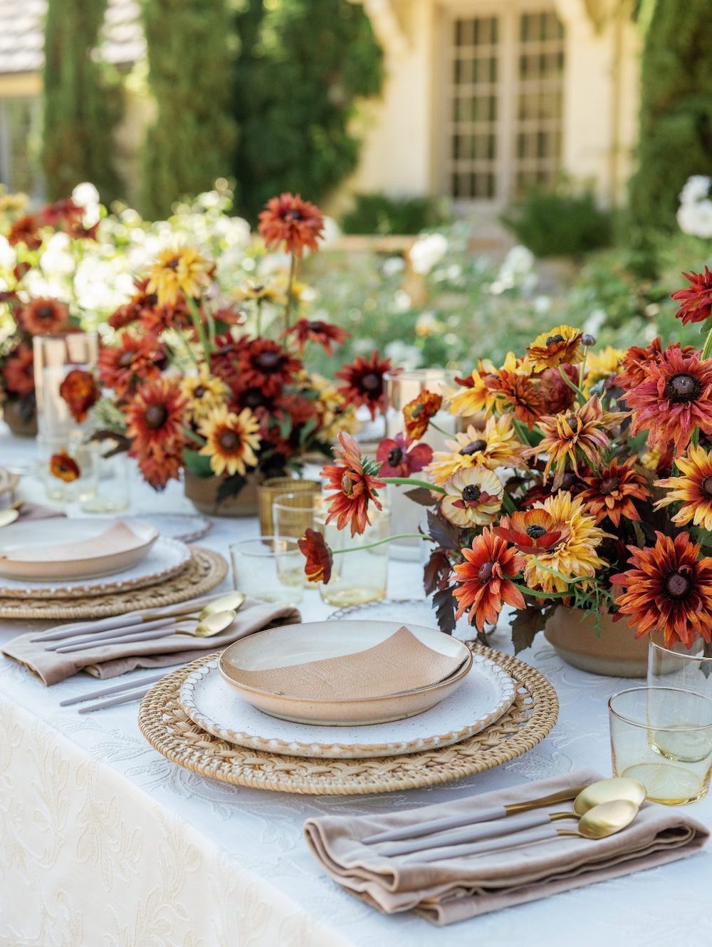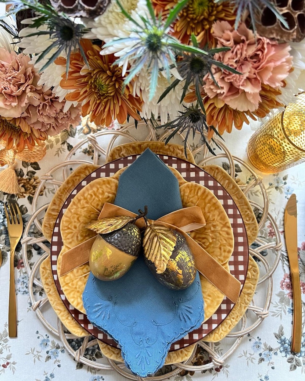 Gold, copper, and bronze accents are gorgeous in a fall tablescape. “Warm metals and floral tones […] create an inviting fall table,” and the metallic accents add a subtle pop of glam. We also love how metals add a contrasting texture against the soft autumn flowers and linens across this table.