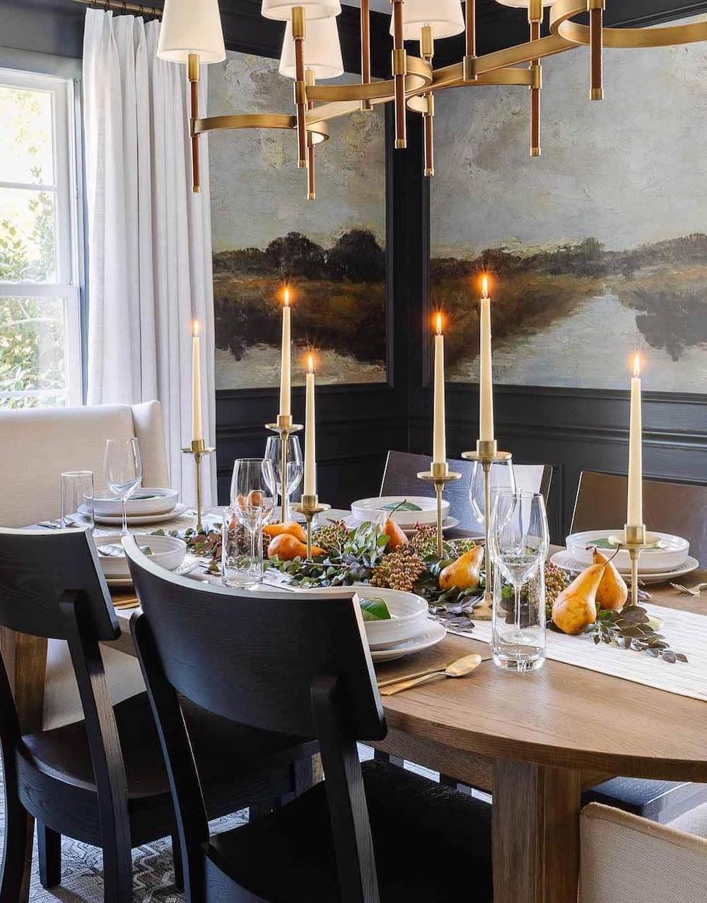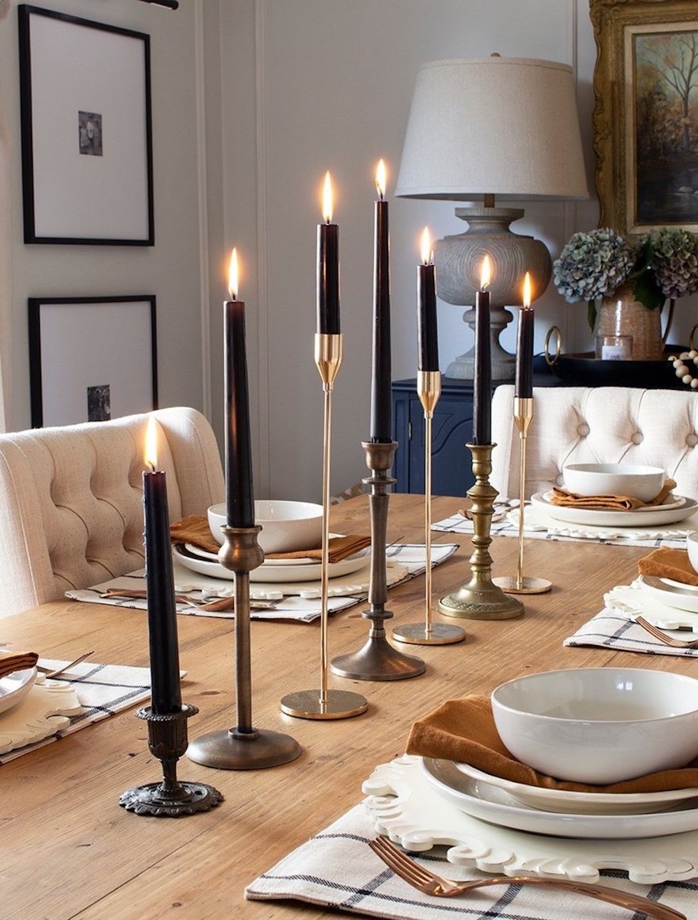 We’re obsessed with the assortment of candlesticks here, lending elegance and interest to this minimalist design. Dark candles add a moody touch, but you can opt for a combo of red, orange, and green candles for a classic fall aesthetic.