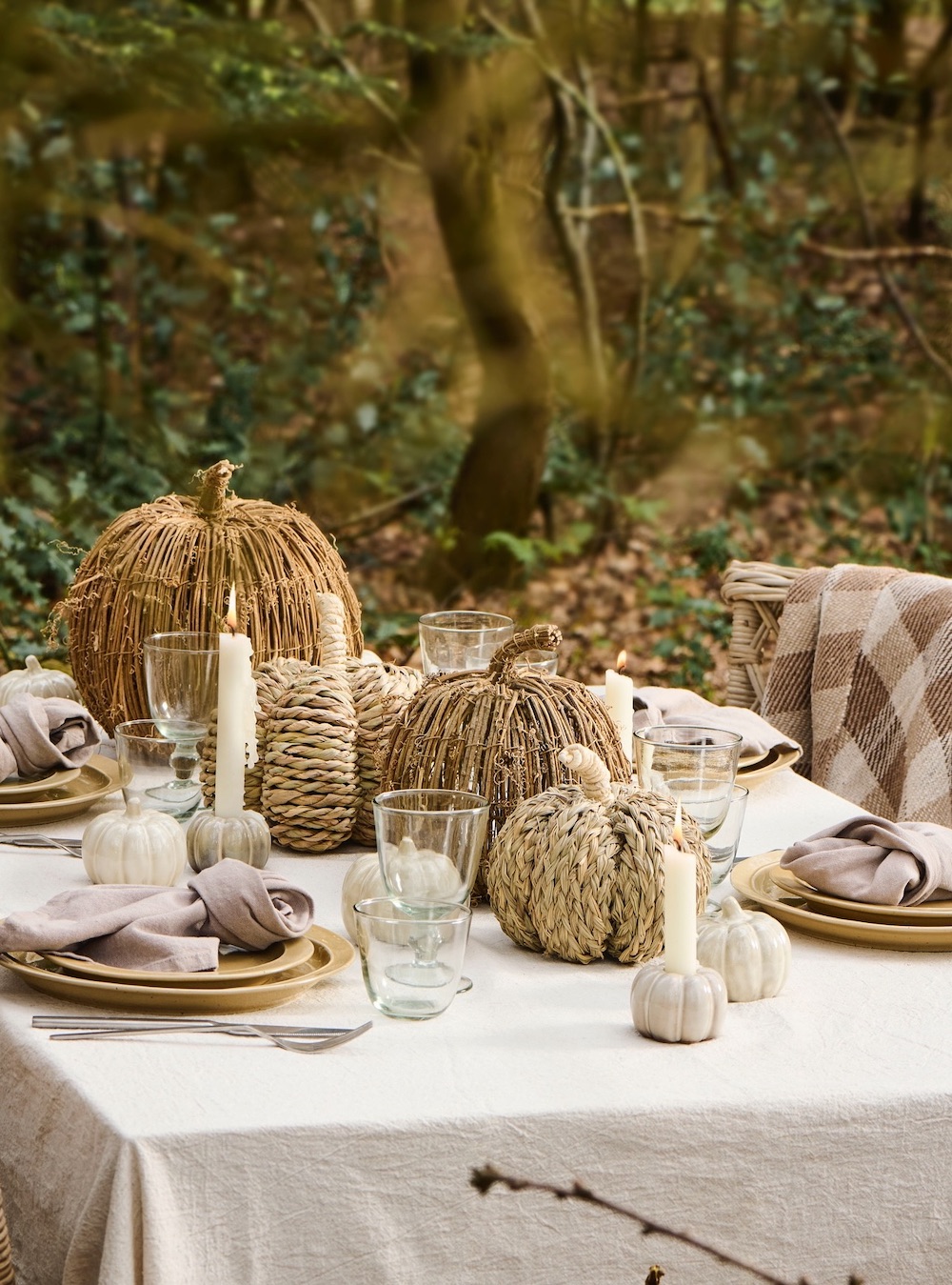 Wicker and plaid come together for a timeless and sophisticated appeal. The cozy textures and rustic wicker pumpkins instantly create an autumn-inspired aesthetic while giving this tablescape a vintage feel.