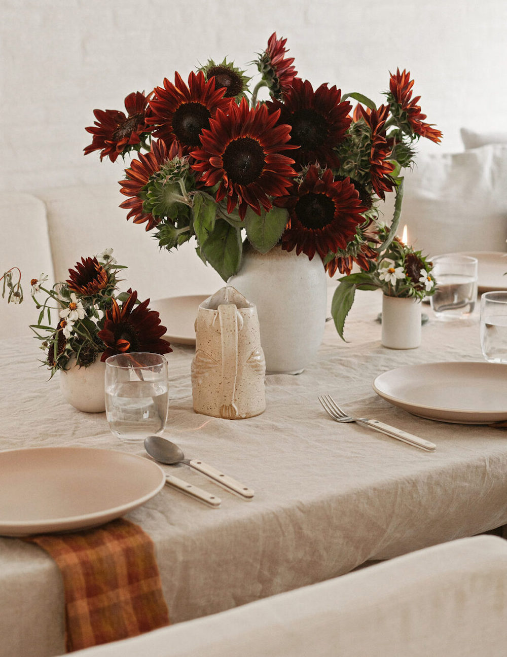 For those who prefer a modern yet earthy vibe, consider adding organic flair with light linens and stoneware pieces. A pop of dark red from the mums adds a striking contrast to these soft, neutral tones while adding a seasonal touch.