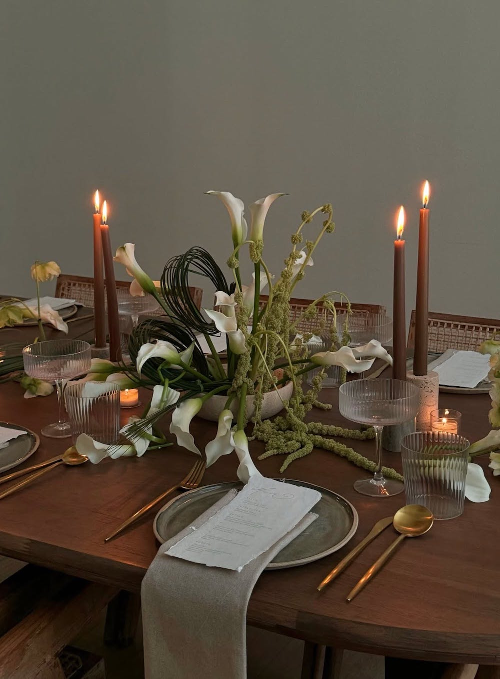 Glowing candles add warmth and ambiance, finishing the space with a welcoming appeal, perfect for inviting guests to sit, get cozy, and enjoy a holiday meal together.