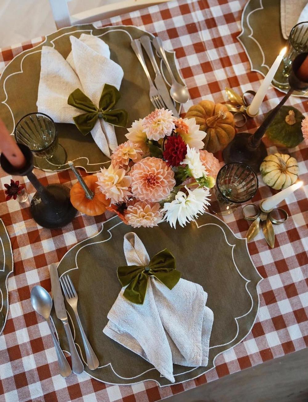 Seasonal flowers make a vibrant centerpiece, while velvet bows and a gingham tablecloth add gorgeous, vintage appeal. Finish this table decor with antique candlesticks nestled between pumpkins to create an old-fashioned yet elegant display.