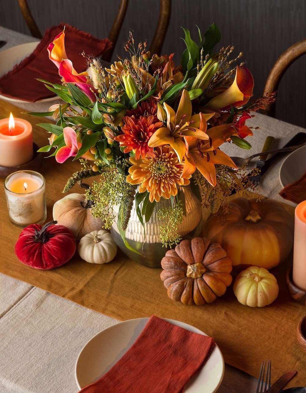A radiant display with a mustard orange runner, layered under bright autumn flowers and velvet pumpkins, creates a vibrant and energetic table setting.