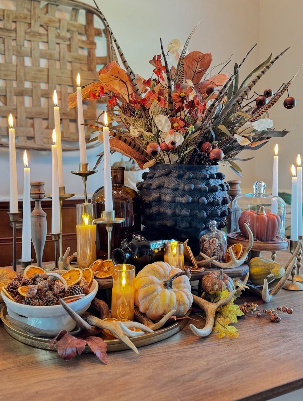Fill a black vase with unique fall florals, and surround this centerpiece with candles, pinecones, glass jars, dried orange slices, and antler decor for an eerie yet enchanting atmosphere.
