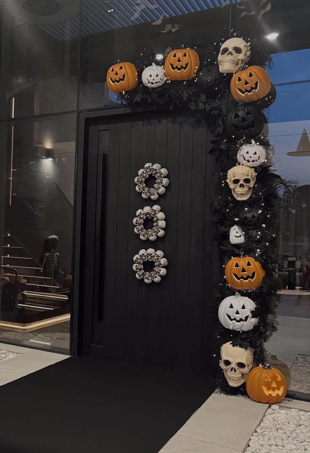 The combination of Jack O’Lanterns and skulls creates a look that’s both traditional and eerie. Skulls can be arranged to form a spooky Halloween wreath, while grinning pumpkins and faux skulls can be stacked along a doorway garland.