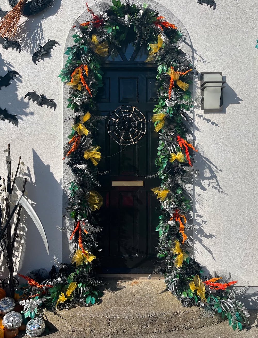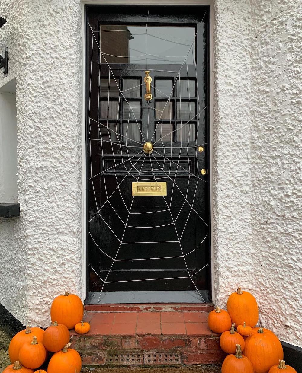 Create a large DIY spiderweb across the front door for a cute and contemporary look. Add orange pumpkins for a touch of traditional Halloween decor, and you can even add fake spiders along the webbing or pumpkins for a playful feel.