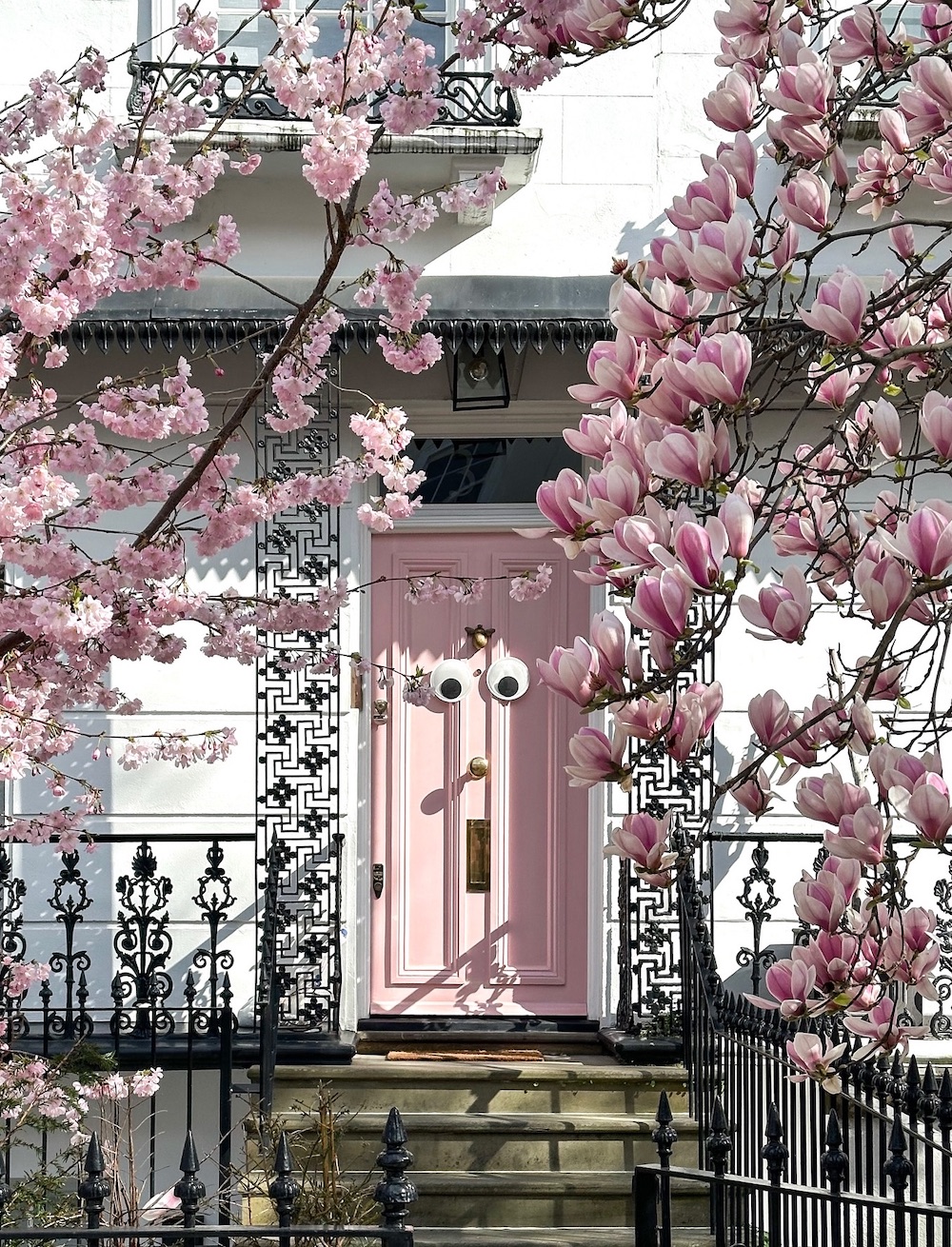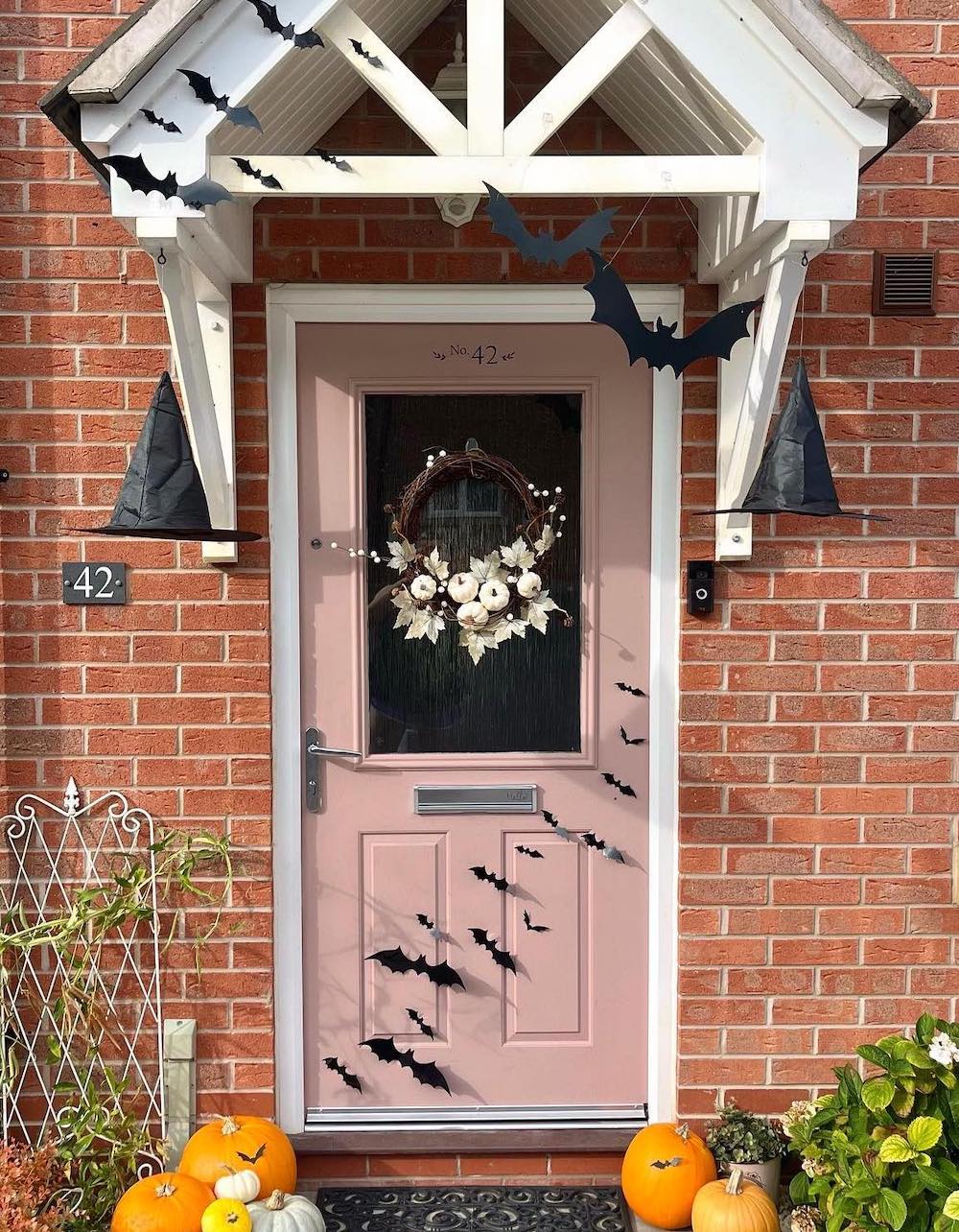Who says Halloween has to be dark and moody? Embrace a modern and feminine holiday look with a pink front door and stark black bats.