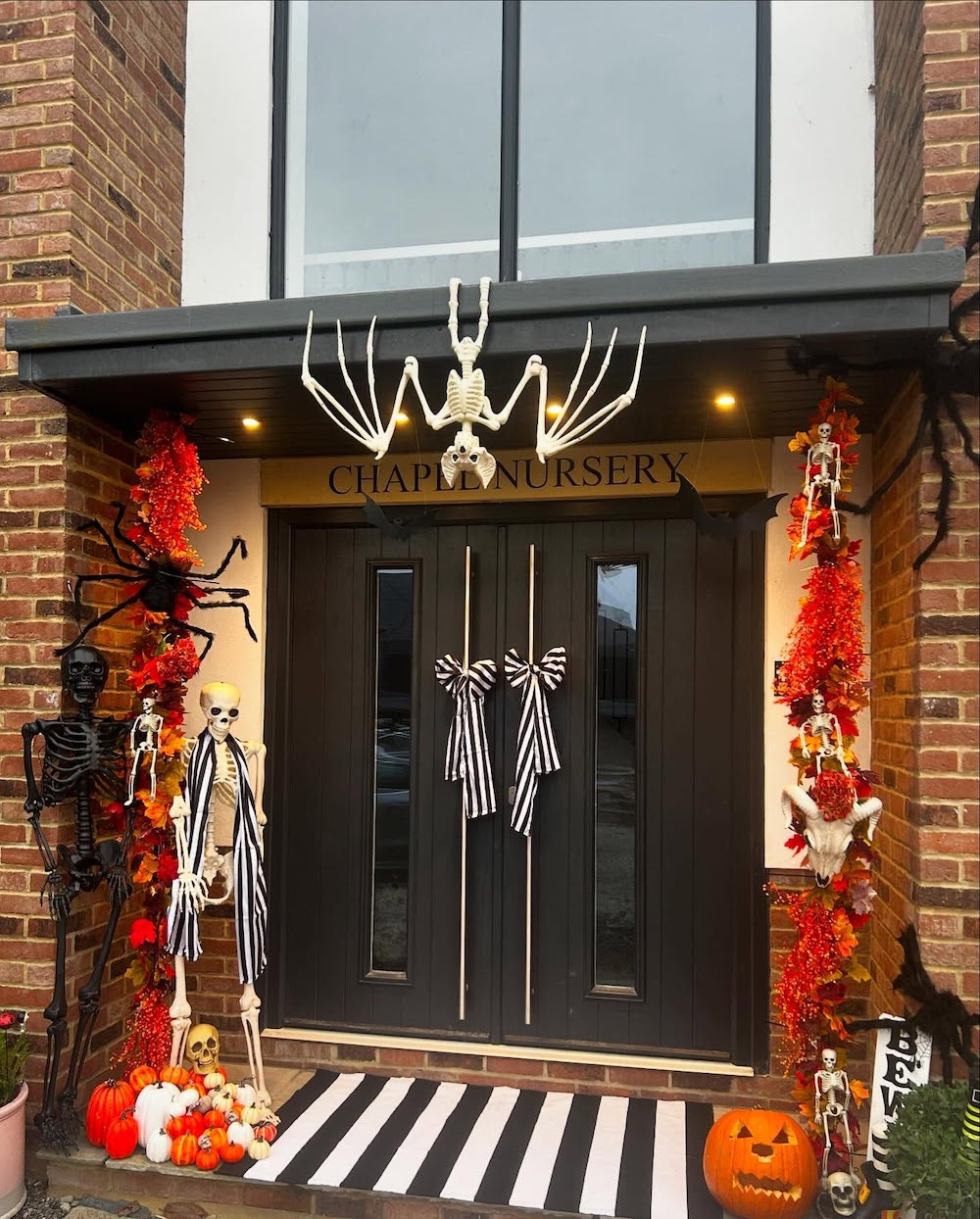 Go for a traditional Halloween display with classic orange and black tones and plenty of faux skeletons! This design is ideal for a nostalgic and whimsical holiday look.