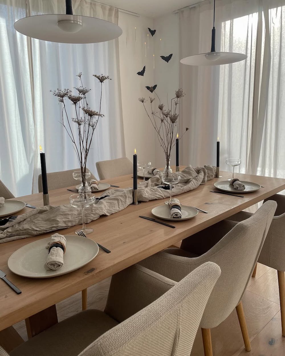 Tall, elegant blooms and dainty floating black bats have a playful yet classy appeal. This display is perfect for an intimate and tranquil dinner with subtle, spooky vibes.