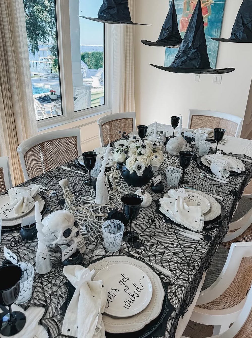 This table setting has a comforting and classic feel, and the floating witch hats in particular add a whimsical touch perfect for a party. Start with neutral florals as the centerpiece and add skeletons, skulls, and other spooky details to fill the rest of the table.