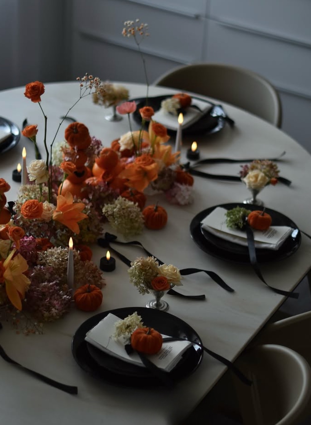 Alternatively, for those who love vibrant colors and plenty of natural texture, bright, autumn-toned florals can help bring your Halloween table decorations to life.