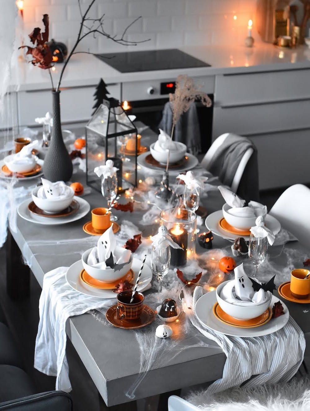 Fun, whimsical details like mini pumpkins, ghost napkins, and cotton cobwebs add a playful feel to the room.