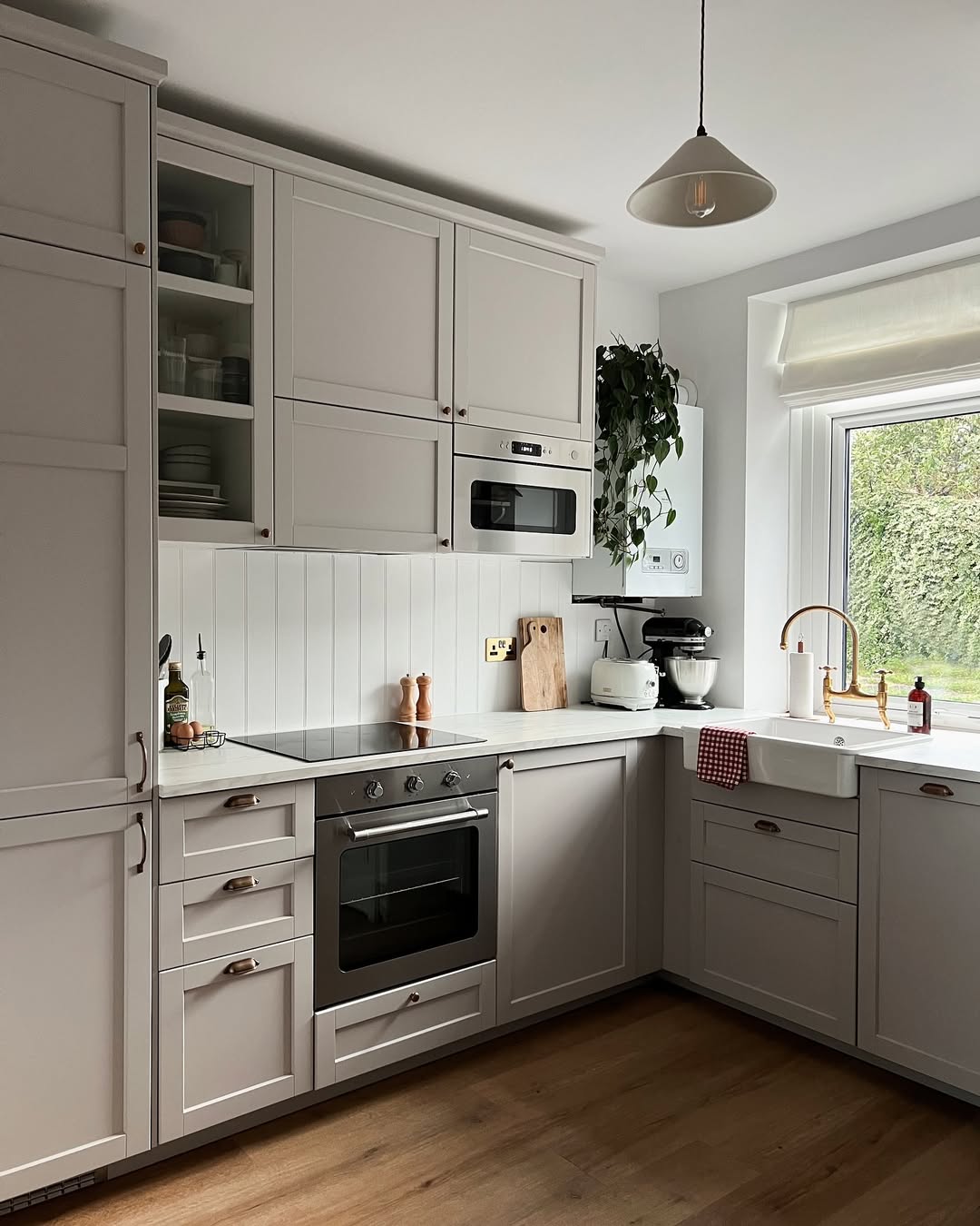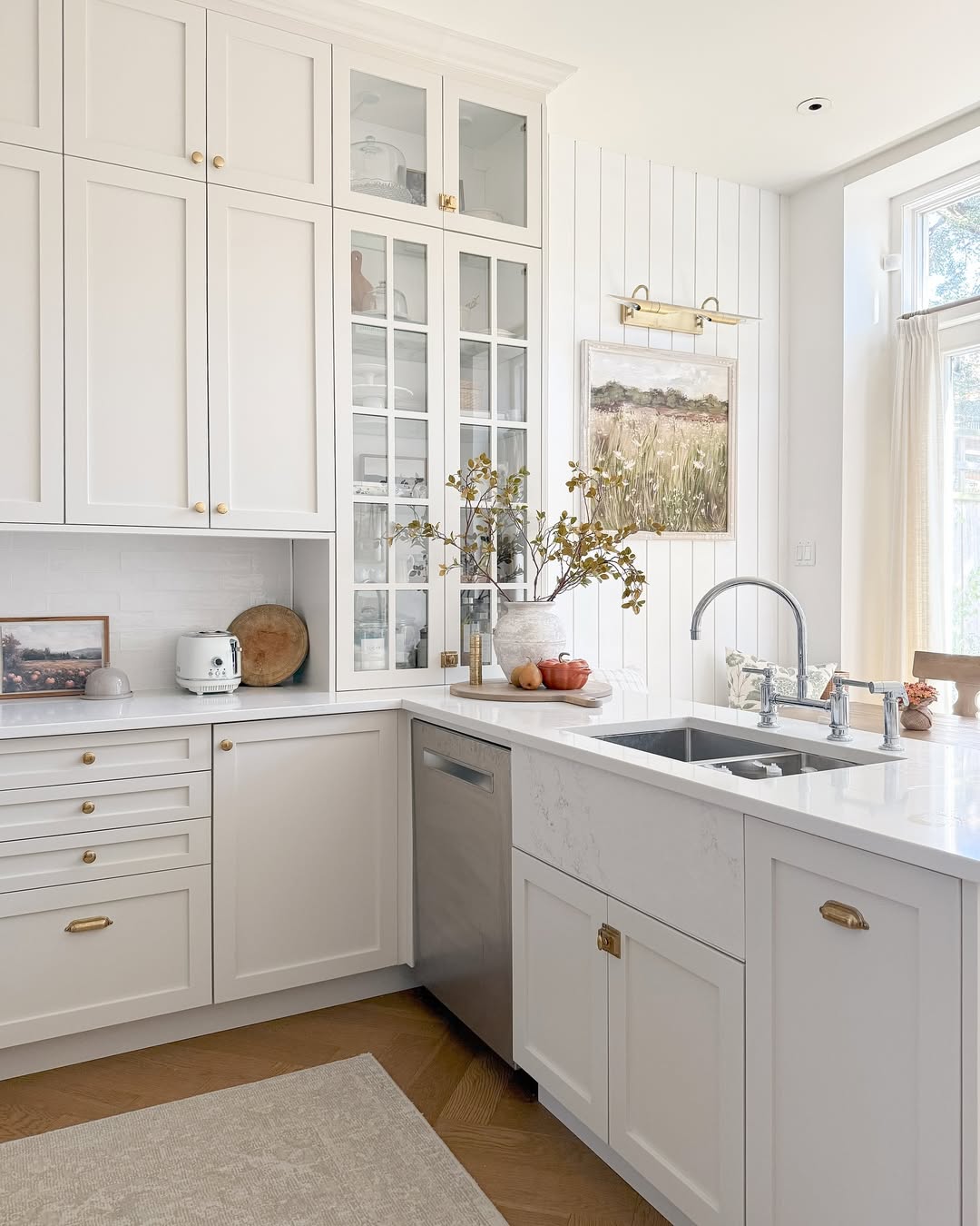 Soft grey shaker cabinets set a calm foundation, while brass fixtures add warmth and polish. Vertical paneling brings depth without overwhelming the room, and the farmhouse sink anchors the layout. Natural light keeps everything feeling open, and even small accents feel considered rather than cluttered. Gentle colors and timeless materials do the heavy lifting here.