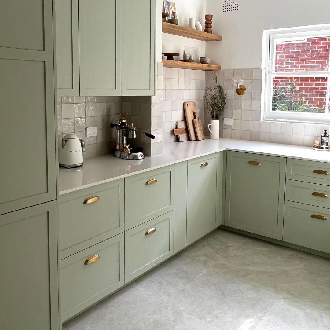 Sage green feels calm without being dull, and this kitchen shows exactly why it works so well. Shaker drawers keep the look grounded, brass pulls add warmth, and wood accents bring everything back to nature. Handmade tile introduces character without noise. Muted tones, soft textures, and natural finishes create a sense of ease and comfort throughout the space.