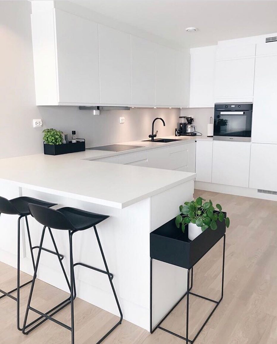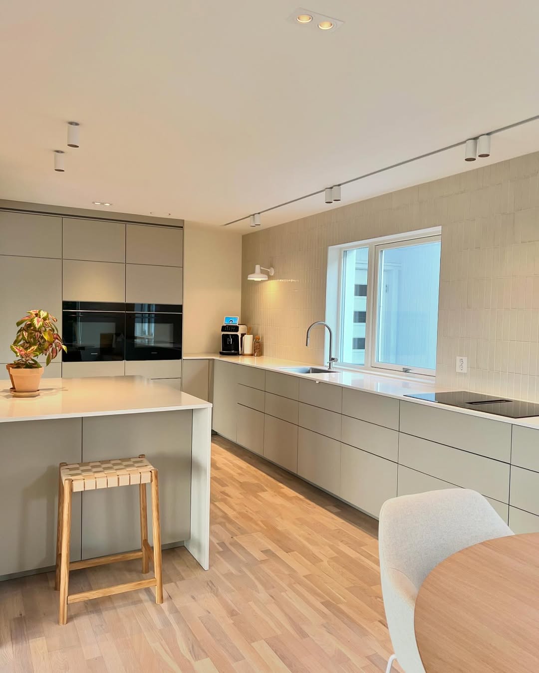 All-white doesn’t have to feel cold. Matte black fixtures and stools create a sharp contrast against soft flooring and flat-panel cabinetry. Handleless fronts keep the surfaces sleek, and the lack of visual clutter lets the architecture stand out. Even the plants feel intentional. High-contrast, clean layouts and smart storage keep everything feeling calm yet defined.